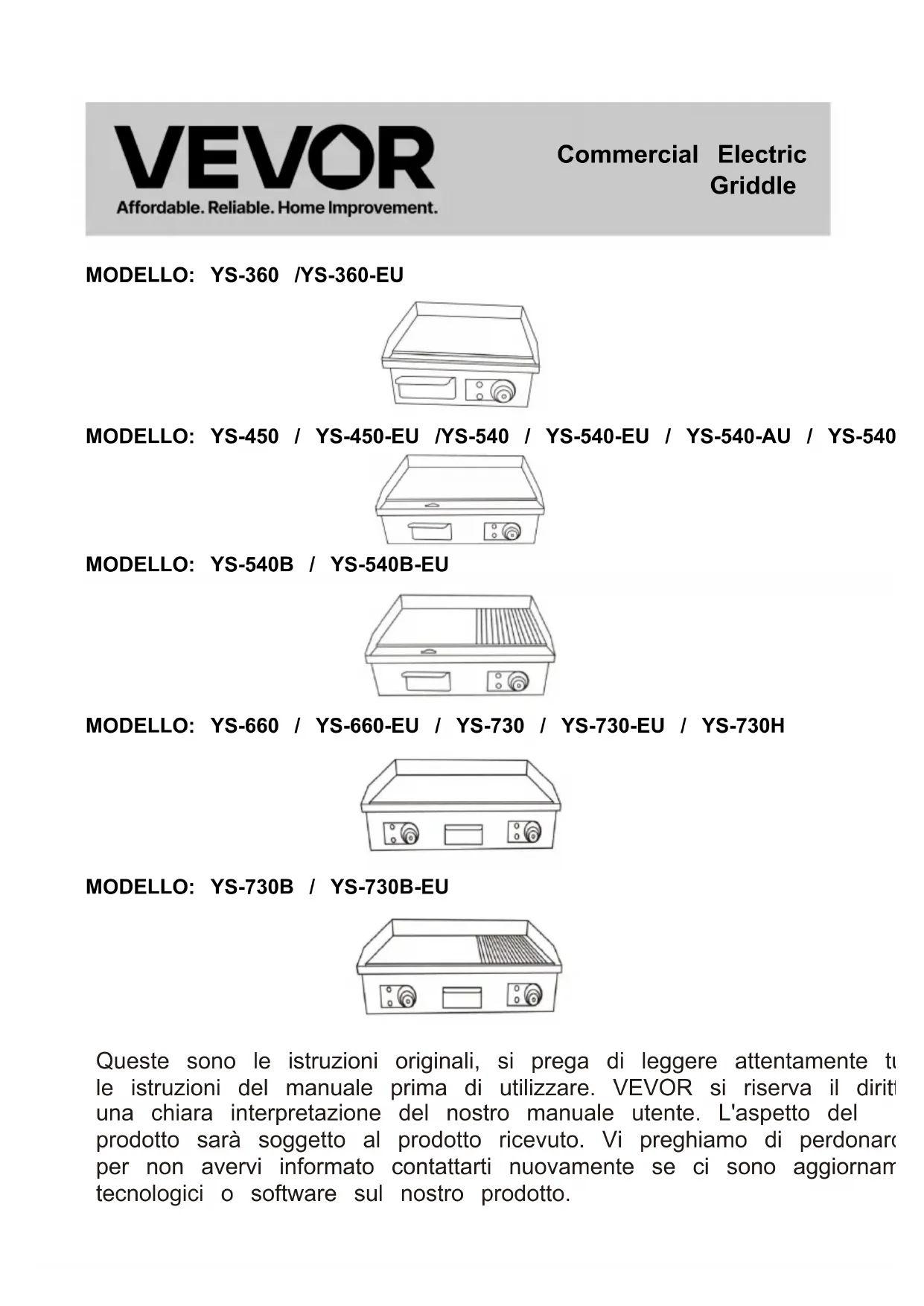 YS540EU - Piastra per griglia Vevor - Manuale utente e istruzioni gratuiti
