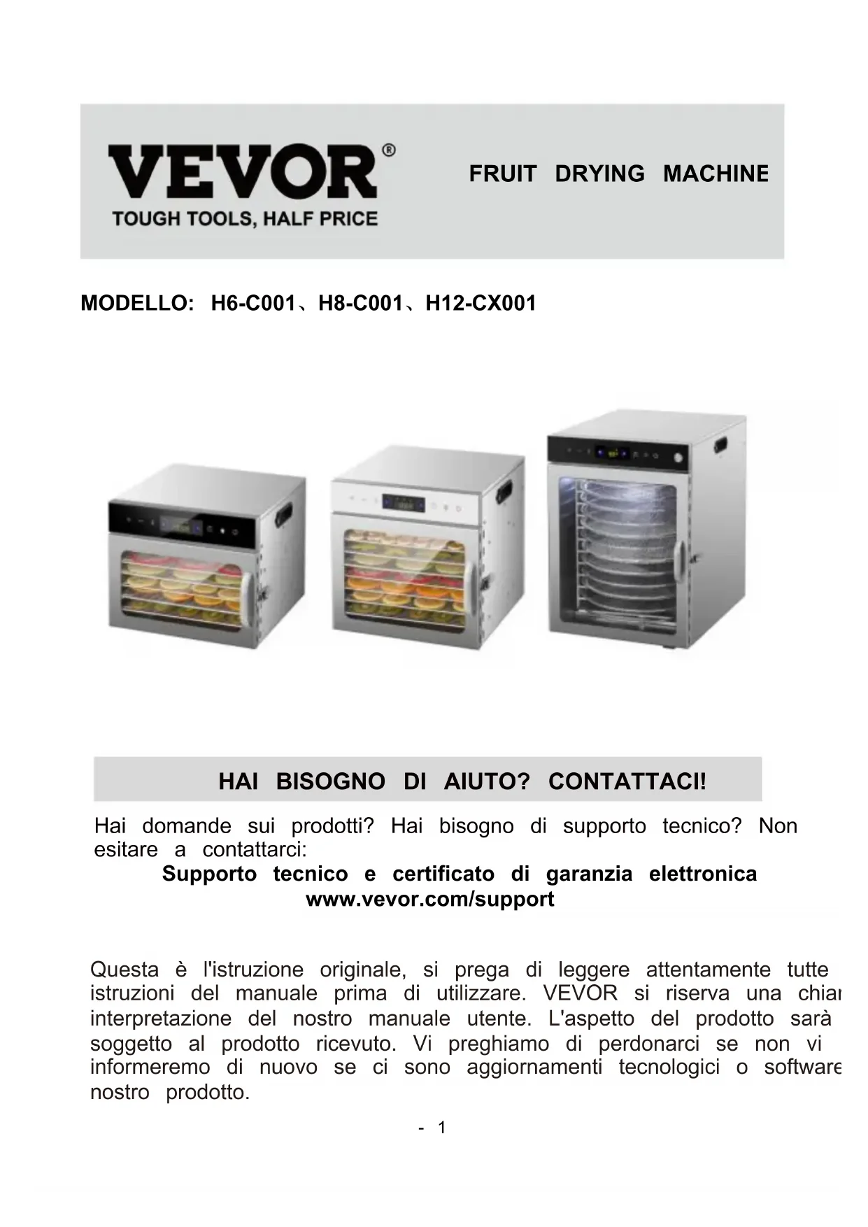 MODELLO: H6-C001、H8-C001、H12-CX001 Continuiamo a impegnarci per fornirvi strumenti a prezzi competitivi. "Risparmia la metà", "Metà prezzo" o altre espressioni simili utilizzate solo da noi rappresenta una stima dei risparmi che potresti ottenere acquistando determinati strumenti con noi rispetto ai principali marchi top e non significa necessariamente copertina tutte le categorie di strumenti da noi offerti. Ti ricordiamo cortesemente di verificare accuratamente quando effettui un ordine con noi se sei effettivamente Risparmio Metà rispetto ai marchi più importanti.- 1 - MODELLO: H6-C001、H8-C001、H12-CX001 HAI BISOGNO DI AIUTO? CONTATTACI! Hai domande sui prodotti? Hai bisogno di supporto tecnico? Non esitare a contattarci: Supporto tecnico e certificato di garanzia elettronica www.vevor.com/support Questa è l'istruzione originale, si prega di leggere attentamente tutte le istruzioni del manuale prima di utilizzare. VEVOR si riserva una chiara interpretazione del nostro manuale utente. L'aspetto del prodotto sarà soggetto al prodotto ricevuto. Vi preghiamo di perdonarci se non vi informeremo di nuovo se ci sono aggiornamenti tecnologici o software sul nostro prodotto.