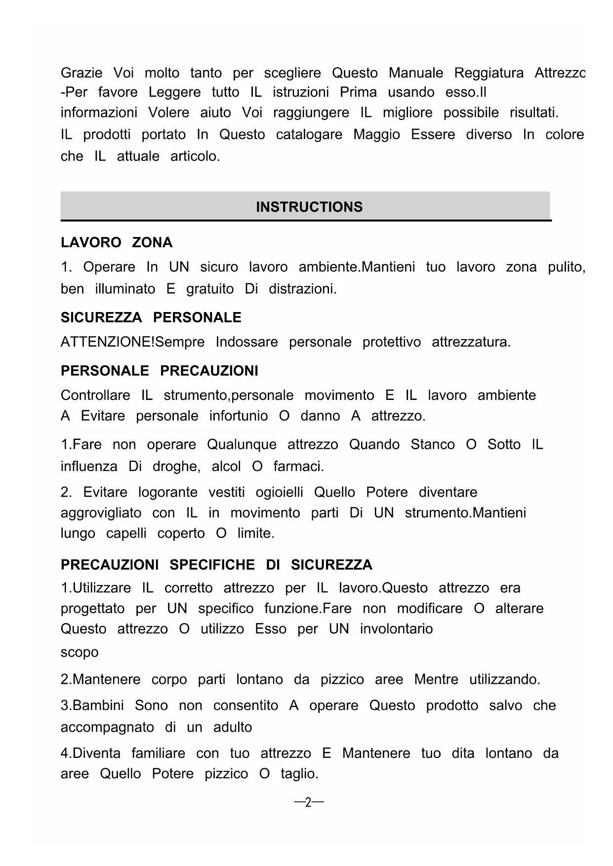 Grazie Voi molto tanto per scegliere Questo Manuale Reggiatura Attrezzo -Per favore Leggere tutto IL istruzioni Prima usando esso.Il informazioni Volere aiuto Voi raggiungere IL migliore possibile risultati. IL prodotti portato In Questo catalogare Maggio Essere diverso In colore che IL attuale articolo. INSTRUCTIONS LAVORO ZONA