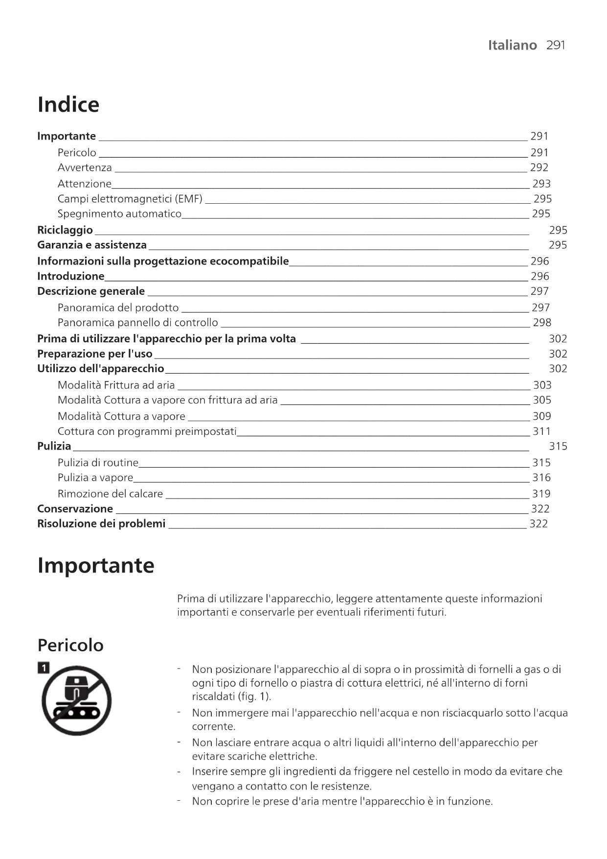 Prima di utilizzare l'apparecchio per la prima volta Importante: durante il primo utilizzo, Airfryer potrebbe emettere fumo e odori. Si tratta di un fenomeno del tutto normale che dovrebbe scomparire in pochi minuti. Attenzione: questo è un Airfryer che utilizza aria calda. Non riempire il recipiente di olio, grasso per frittura o altri liquidi. Attenzione: non toccare le superfici calde. Maneggiare il recipiente caldo con guanti da forno. Attenzione: questo apparecchio è esclusivamente per uso domestico. Nota: Non è necessario preriscaldare l'apparecchio. 1 Rimuovere tutto il materiale di imballaggio. 2 Rimuovere tutti gli eventuali adesivi o etichette dall'apparecchio. 3 Pulire accuratamente l'apparecchio prima del primo utilizzo. Preparazione per l'uso 1 Posizionare l'apparecchio su una superficie stabile, piana e termoresistente. Assicurarsi che vi sia spazio sufficiente sul tavolo per estendere la guida quando viene estratto il recipiente. 2 Lasciare almeno 15 cm di spazio libero sul retro dell'apparecchio. Nota: durante l'utilizzo, viene emesso vapore attraverso le prese d'aria. Tenere le mani e il viso a distanza di sicurezza dal vapore e dalle prese d'aria. Collocare il dispositivo ad almeno 15 cm dalla parete e non posizionare le prese d'aria direttamente di fronte alla presa elettrica. Nota: non collocare oggetti sopra o accanto all'apparecchio. Farlo potrebbe ostacolare il flusso di aria e compromettere il risultato della frittura. Nota: Non collocare Airfryer accanto a un altro apparecchio di cottura, vicino alla parete della cucina o sotto un pensile, poiché il vapore caldo potrebbe condensarsi e colare lungo le superfici. Utilizzo dell'apparecchio Questo apparecchio con funzione vapore offre tre modalità di cottura versatili pensate per soddisfare un'ampia gamma di esigenze culinarie.303 Italiano