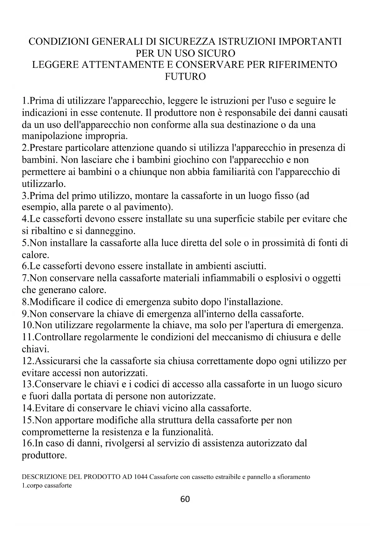 FUTURO 1.Prima di utilizzare l'apparecchio, leggere le istruzioni per l'uso e seguire le indicazioni in esse contenute. Il produttore non è responsabile dei danni causati da un uso dell'apparecchio non conforme alla sua destinazione o da una manipolazione impropria. 2.Prestare particolare attenzione quando si utilizza l'apparecchio in presenza di bambini. Non lasciare che i bambini giochino con l'apparecchio e non permettere ai bambini o a chiunque non abbia familiarità con l'apparecchio di utilizzarlo. 3.Prima del primo utilizzo, montare la cassaforte in un luogo fisso (ad esempio, alla parete o al pavimento). 4.Le casseforti devono essere installate su una superficie stabile per evitare che si ribaltino e si danneggino. 5.Non installare la cassaforte alla luce diretta del sole o in prossimità di fonti di calore. 6.Le casseforti devono essere installate in ambienti asciutti. 7.Non conservare nella cassaforte materiali infiammabili o esplosivi o oggetti che generano calore. 8.Modificare il codice di emergenza subito dopo l'installazione. 9.Non conservare la chiave di emergenza all'interno della cassaforte. 10.Non utilizzare regolarmente la chiave, ma solo per l'apertura di emergenza. 11.Controllare regolarmente le condizioni del meccanismo di chiusura e delle chiavi. 12.Assicurarsi che la cassaforte sia chiusa correttamente dopo ogni utilizzo per evitare accessi non autorizzati. 13.Conservare le chiavi e i codici di accesso alla cassaforte in un luogo sicuro e fuori dalla portata di persone non autorizzate. 14.Evitare di conservare le chiavi vicino alla cassaforte. 15.Non apportare modifiche alla struttura della cassaforte per non comprometterne la resistenza e la funzionalità. 16.In caso di danni, rivolgersi al servizio di assistenza autorizzato dal produttore. DESCRIZIONE DEL PRODOTTO AD 1044 Cassaforte con cassetto estraibile e pannello a sfioramento 1.corpo cassaforte61