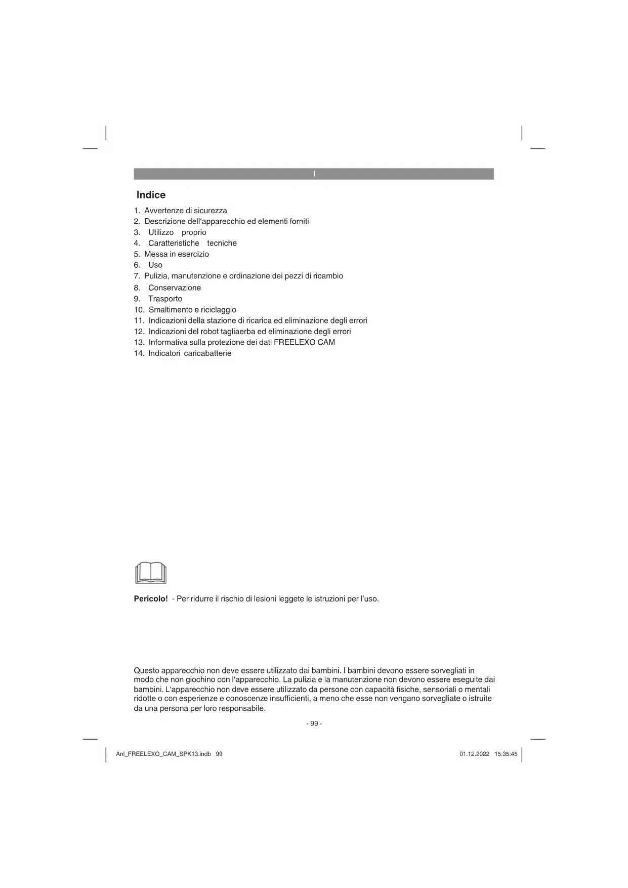 Pericolo! - Per ridurre il rischio di lesioni leggete le istruzioni per l’uso. Questo apparecchio non deve essere utilizzato dai bambini. I bambini devono essere sorvegliati in modo che non giochino con l‘apparecchio. La pulizia e la manutenzione non devono essere eseguite dai bambini. L‘apparecchio non deve essere utilizzato da persone con capacità fi siche, sensoriali o mentali ridotte o con esperienze e conoscenze insuffi cienti, a meno che esse non vengano sorvegliate o istruite da una persona per loro responsabile. Anl_FREELEXO_CAM_SPK13.indb 99Anl_FREELEXO_CAM_SPK13.indb 99 01.12.2022 15:35:4501.12.2022 15:35:45I