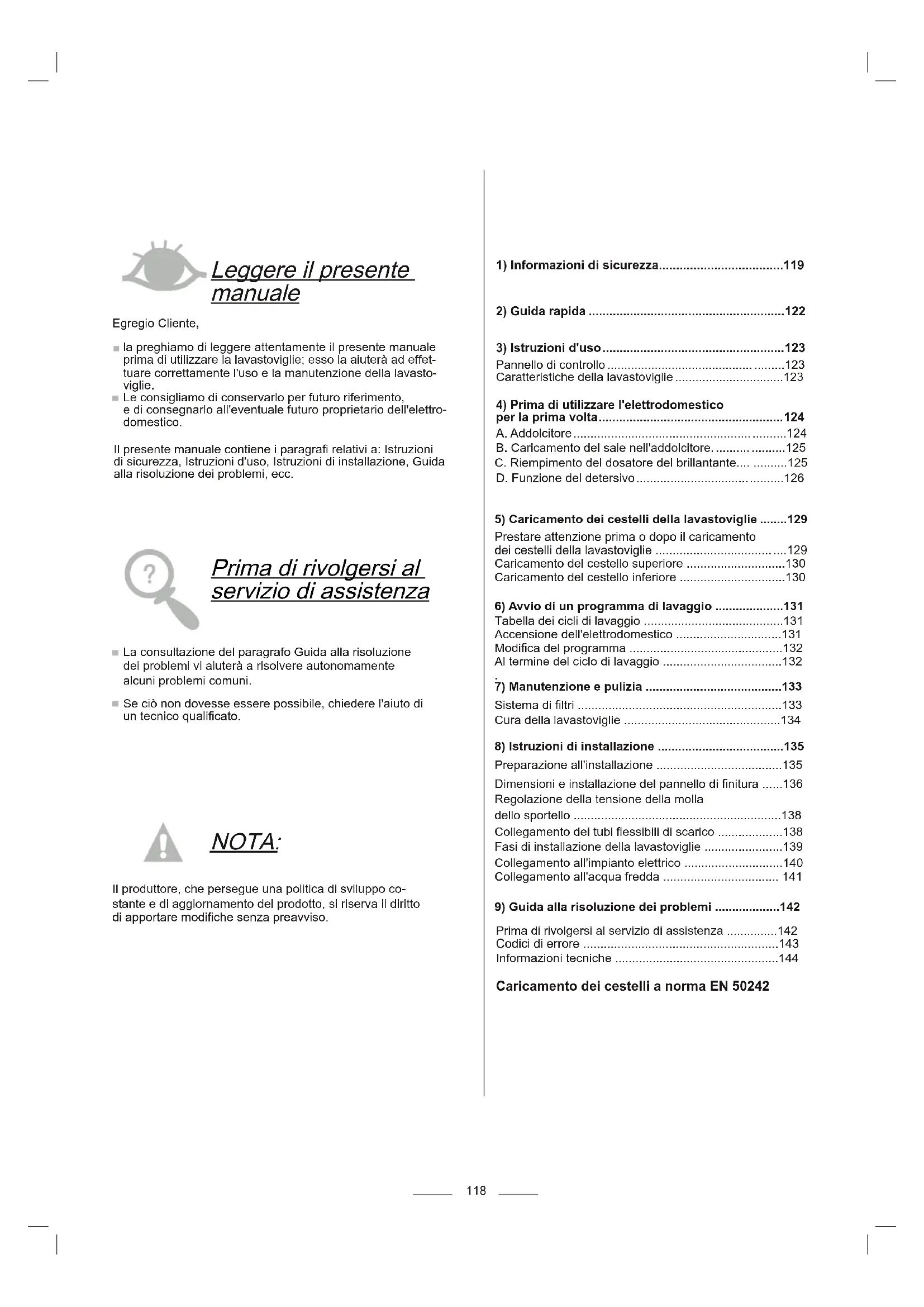 66Prima di rivolgersi al servizio di assistenza Leggere il presente manuale Egregio Cliente, la preghiamo di leggere attentamente il presente manuale prima di utilizzare la lavastoviglie; esso la aiuterà ad effet-tuare correttamente l'uso e la manutenzione della lavasto-viglie. Le consigliamo di conservarlo per futuro riferimento, e di consegnarlo all'eventuale futuro proprietario dell'elettro-domestico. Il presente manuale contiene i paragra relativi a: Istruzioni di sicurezza, Istruzioni d'uso, Istruzioni di installazione, Guida alla risoluzione dei problemi, ecc. La consultazione del paragrafo Guida alla risoluzione dei problemi vi aiuterà a risolvere autonomamente alcuni problemi comuni. Se ciò non dovesse essere possibile, chiedere l'aiuto di un tecnico qualicato. NOTA: Il produttore, che persegue una politica di sviluppo co-stante e di aggiornamento del prodotto, si riserva il diritto di apportare modiche senza preavviso.