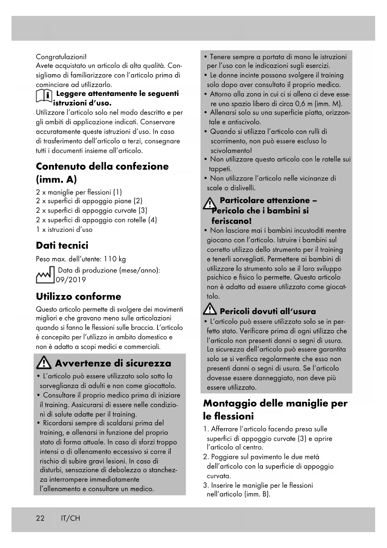 nell’articolo (imm. B). Congratulazioni! Avete acquistato un articolo di alta qualità. Con- sigliamo di familiarizzare con l’articolo prima di cominciare ad utilizzarlo. Leggere attentamente le seguenti istruzioni d’uso. Utilizzare l’articolo solo nel modo descritto e per gli ambiti di applicazione indicati. Conservare accuratamente queste istruzioni d’uso. In caso di trasferimento dell’articolo a terzi, consegnare tutti i documenti insieme all’articolo. Contenuto della confezione (imm. A) 2 x maniglie per flessioni (1) 2 x superfici di appoggio piane (2) 2 x superfici di appoggio curvate (3) 2 x superfici di appoggio con rotelle (4) 1 x istruzioni d’uso Dati tecnici Peso max. dell‘utente: 110 kg Data di produzione (mese/anno): 09/2019 Utilizzo conforme Questo articolo permette di svolgere dei movimenti migliori e che gravano meno sulle articolazioni quando si fanno le flessioni sulle braccia. L‘articolo è concepito per l‘utilizzo in ambito domestico e non è adatto a scopi medici e commerciali. Avvertenze di sicurezza