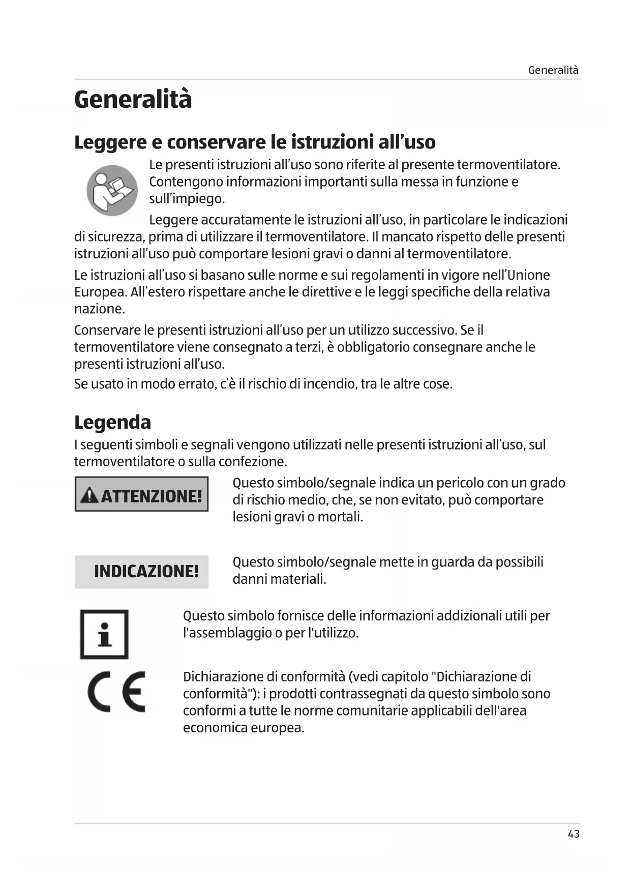 Generalità Leggere e conservare le istruzioni all’uso Le presenti istruzioni all’uso sono riferite al presente termoventilatore. Contengono informazioni importanti sulla messa in funzione e sull’impiego. Leggere accuratamente le istruzioni all’uso, in particolare le indicazioni di sicurezza, prima di utilizzare il termoventilatore. Il mancato rispetto delle presenti istruzioni all’uso può comportare lesioni gravi o danni al termoventilatore. Le istruzioni all’uso si basano sulle norme e sui regolamenti in vigore nell’Unione Europea. All’estero rispettare anche le direttive e le leggi specifiche della relativa nazione. Conservare le presenti istruzioni all’uso per un utilizzo successivo. Se il termoventilatore viene consegnato a terzi, è obbligatorio consegnare anche le presenti istruzioni all’uso. Se usato in modo errato, c’è il rischio di incendio, tra le altre cose. Legenda I seguenti simboli e segnali vengono utilizzati nelle presenti istruzioni all’uso, sul termoventilatore o sulla confezione. ATTENZIONE! Questo simbolo/segnale indica un pericolo con un grado di rischio medio, che, se non evitato, può comportare lesioni gravi o mortali. INDICAZIONE! Questo simbolo/segnale mette in guarda da possibili danni materiali. Questo simbolo fornisce delle informazioni addizionali utili per l'assemblaggio o per l'utilizzo. Dichiarazione di conformità (vedi capitolo "Dichiarazione di conformità"): i prodotti contrassegnati da questo simbolo sono conformi a tutte le norme comunitarie applicabili dell'area economica europea. Buch_CH_Heizlüfter .indb 43Buch_CH_Heizlüfter .indb 43 07.09.2022 12:00:5407.09.2022 12:00:54Sicurezza