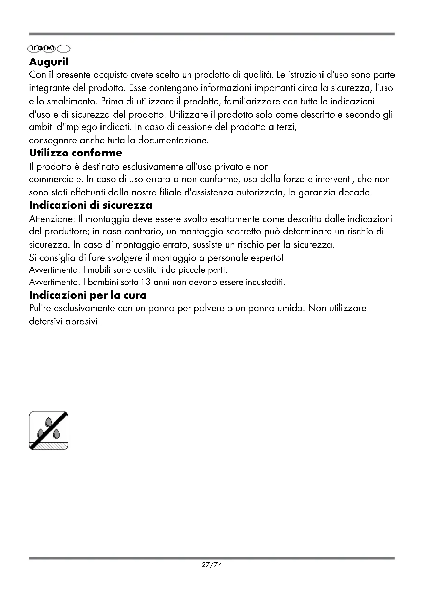 Periodo di garanzia e richieste legali di garanzia Il periodo di garanzia non viene prolungato dalle prestazioni in garanzia. Lo stesso si applica a parti sostituite o riparate. I danni o difetti presenti già all'acquisto devono essere comunicati immediatamente dopo l'apertura dell'imballaggio. I costi delle riparazioni svolte dopo la decorrenza del periodo garanzia sono a carico del consumatore. Livello di garanzia Il prodotto è stato accuratamente realizzato secondo rigidi criteri di qualità e coscienziosamente testato prima della consegna. Le prestazioni di garanzia coprono gli errori di materiale e di fabbricazione. La garanzia non copre le parti di prodotto soggette ad usura normale, che, pertanto, sono considerate pezzi soggetti ad usura, o il danneggiamento di parti delicate, come interruttori o parti di vetro. La garanzia decade in caso di danneggiamento del prodotto, uso non conforme o mancata manutenzione. Per un uso conforme è necessario rispettare con attenzione tutte le indicazioni contenute nel manuale d'uso. Gli scopi d'impiego e gli usi, che vengono sconsigliati o da cui si viene ammoniti nelle istruzioni per l'uso, devono essere evitati a tutti i costi. Garanzia Gentili clienti, Il prodotto da voi acquistato è coperto da una garanzia triennale a decorrere dalla data d'acquisto. In caso di difetti di questo prodotto, vi sono garantiti dei diritti legali nei confronti del venditore del prodotto. Questi diritti legali non vengono limitati dalla nostra garanzia descritta al seguito. Condizioni di garanzia Il periodo di garanzia decorre dalla data d'acquisto. Si prega di conservare con cautela lo scontrino originale. Quest'ultimo è necessario per attestare l'acquisto. Se un difetto di materiale o di fabbricazione si verifica entro tre anni dalla data di acquisto di questo prodotto, a nostra discrezione, ripareremo o sostituiremo il prodotto senza alcun costo per voi, o vi rimborseremo il prezzo di acquisto. Al fine di potere usufruire delle prestazioni di garanzia entro il periodo dei tre anni, è necessario che il prodotto difettoso e lo scontrino fiscale vengano consegnati, unitamente a una breve descrizione in cui si indica il difetto e il momento in cui si è presentato. Se il difetto è coperto dalla nostra garanzia, provvederemo a restituirvi il prodotto riparato o un nuovo prodotto. La riparazione o la sostituzione del prodotto non determina la decorrenza di un nuovo periodo di garanzia. La prestazione in garanzia vale per difetti del materiale o di fabbricazione. Questa garanzia non si estende a componenti del prodotto esposti a normale CH MT29/74 logorio, che possono pertanto essere considerati come componenti soggetti a usura (esempio capacità della batteria, calcificazione, lampade, pneumatici, filtri, spazzole…). La garanzia non si estende altresì a danni che si verificano su componenti delicati (esempio interruttori, batterie, parti realizzate in vetro, schermi, accessori vari) nonché danni derivanti dal trasporto o altri incidenti. Smaltimento Al termine del loro utilizzo, il prodotto e l'imballaggio devono essere smaltiti secondo le norme ambientali. IT CH MT30/74