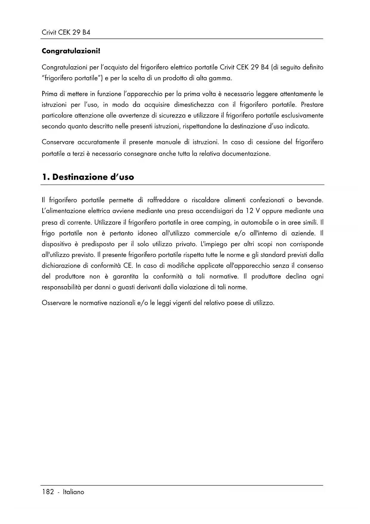Congratulazioni! Congratulazioni per l’acquisto del frigorifero elettrico portatile Crivit CEK 29 B4 (di seguito definito “frigorifero portatile”) e per la scelta di un prodotto di alta gamma. Prima di mettere in funzione l’apparecchio per la prima volta è necessario leggere attentamente le istruzioni per l’uso, in modo da acquisire dimestichezza con il frigorifero portatile. Prestare particolare attenzione alle avvertenze di sicurezza e utilizzare il frigorifero portatile esclusivamente secondo quanto descritto nelle presenti istruzioni, rispettandone la destinazione d’uso indicata. Conservare accuratamente il presente manuale di istruzioni. In caso di cessione del frigorifero portatile a terzi è necessario consegnare anche tutta la relativa documentazione.