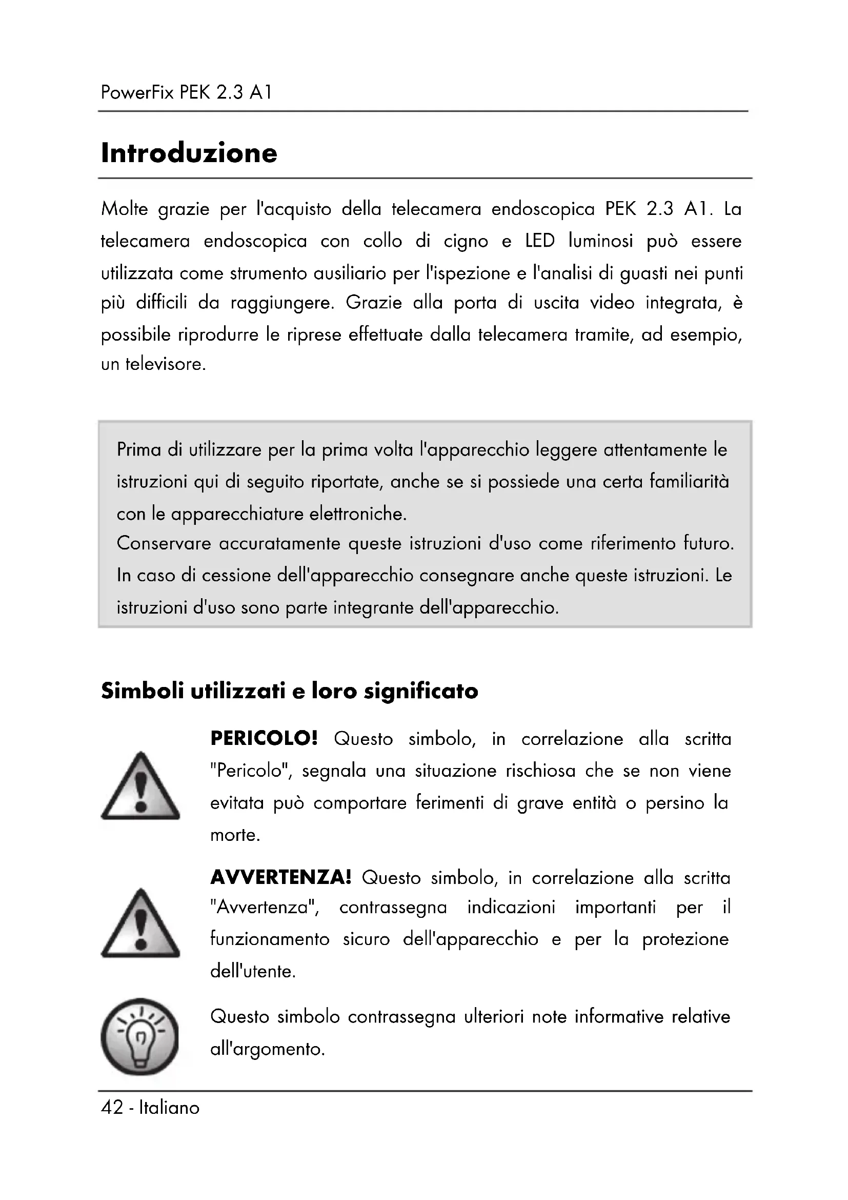 Introduzione Molte grazie per l'acquisto della telecamera endoscopica PEK 2.3 A1. La telecamera endoscopica con collo di cigno e LED luminosi può essere utilizzata come strumento ausiliario per l'ispezione e l'analisi di guasti nei punti più difficili da raggiungere. Grazie alla porta di uscita video integrata, è possibile riprodurre le riprese effettuate dalla telecamera tramite, ad esempio, un televisore. Prima di utilizzare per la prima volta l'apparecchio leggere attentamente le istruzioni qui di seguito riportate, anche se si possiede una certa familiarità con le apparecchiature elettroniche. Conservare accuratamente queste istruzioni d'uso come riferimento futuro. In caso di cessione dell'apparecchio consegnare anche queste istruzioni. Le istruzioni d'uso sono parte integrante dell'apparecchio. Simboli utilizzati e loro significato PERICOLO! Questo simbolo, in correlazione alla scritta "Pericolo", segnala una situazione rischiosa che se non viene evitata può comportare ferimenti di grave entità o persino la morte. AVVERTENZA! Questo simbolo, in correlazione alla scritta "Avvertenza", contrassegna indicazioni importanti per il funzionamento sicuro dell'apparecchio e per la protezione dell'utente. Questo simbolo contrassegna ulteriori note informative relative all'argomento.PowerFix PEK 2.3 A1 Italiano - 43 Utilizzo conforme alla destinazione d'uso La telecamera endoscopica PEK 2.3 A1 è uno strumento ottico ispettivo, il cui utilizzo non è consentito in ambito medico. La telecamera endoscopica con collo di cigno e LED luminosi può essere utilizzata come strumento ausiliario per l'ispezione e l'analisi di guasti nei punti più difficili da raggiungere. Il collo di cigno è impermeabile all'acqua e adatto all'impiego in liquidi acquosi. Tuttavia non deve essere immerso oltre i 90 cm di profondità. Attenzione: solo il collo di cigno può essere esposto all'umidità, ma non l'unità di controllo (display TFT incl. impugnatura). L'impiego dell'apparecchio in oli, liscivia o acidi non è consentito. PERICOLO! La telecamera endoscopica non deve essere utilizzata in ambito medico e non ne è consentita in ogni caso l'introduzione in orifizi corporei. Il produttore declina ogni responsabilità nel caso in cui la telecamera endoscopica non venga utilizzata conformemente alla destinazione d'uso. in seguito all'utilizzo improprio della telecamera endoscopica o alla mancata osservanza di queste istruzioni d'uso vengano causati danni materiali o alle persone. la telecamera endoscopica venga messa in funzione anche se danneggiata, incompleta o se è stata modificata. Questo apparecchio appartiene al settore della tecnologia informatica. È destinato all'uso privato e non può essere utilizzato per scopi industriali, commerciali o medici. Vi preghiamo di rispettare le direttive locali ovvero le leggi in vigore nel paese in cui viene utilizzato l'apparecchio.PowerFix PEK 2.3 A1