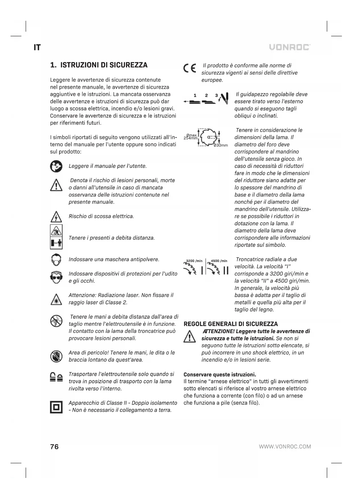 - Sono state utilizzate parti di ricambio non origi- nali. Ciò costituisce l’unica garanzia espressa o implicita fornita dall’azienda. Non esistono altre garanzie espresse o implicite che si estendono oltre il presente documento, ivi comprese le garanzie im plicite di commerciabilità e idoneità per uno scopo particolare. In nessun caso VONROC sarà responsa- bile di eventuali danni incidentali o consequenziali. I rimedi dei rivenditori saranno limitati alla ripara- zione o sostituzione di unità o parti non conformi. Il prodotto e il manuale per l’utente sono soggetti a modifiche. I dati tecnici possono essere modificati senza ulteriore notifica.