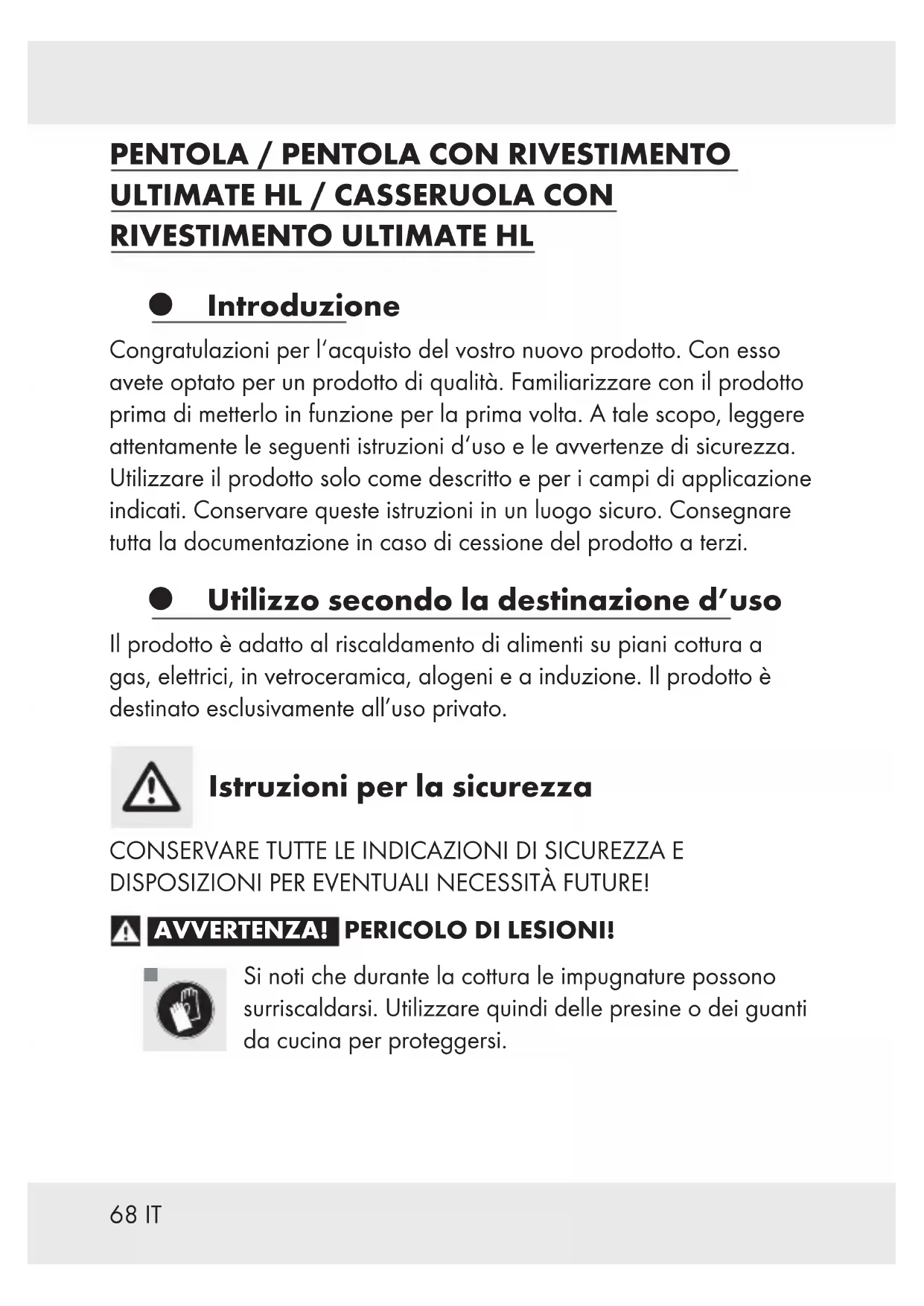 Si noti che durante la cottura le impugnature possono surriscaldarsi. Utilizzare quindi delle presine o dei guanti da cucina per proteggersi.69IT Non utilizzare il coperchio se l’impugnatura è allentata. Non utilizzare mai il prodotto se le impugnature sono allentate. Serrare eventualmente nuovamente il raccordo a vite delle impugnature. AVVERTENZA! PERICOLO DI DANNI A COSE! Quando si cucina, è molto importante non perdere di vista le pentole in cui si scalda il grasso. Il grasso può surriscaldarsi rapidamente e accendersi. Se il grasso dovesse bruciare, non spegnerlo mai con acqua! Soffocare le fiamme con un coperchio o con una coperta di lana spessa. Per evitare di danneggiare il rivestimento antiaderente, utilizzare solo utensili da cucina in plastica resistente al calore o in legno. Non tagliare il cibo direttamente nel prodotto. Non mettere la carne bagnata e gocciolante nel grasso caldo. Gli spruzzi di grasso sul piano di cottura incandescente possono provocare facilmente un incendio. Le alte temperature possono portare allo scolorimento dell’esterno del prodotto. Questo non è un difetto del materiale e non influisce sulla qualità o sul funzionamento del prodotto. Risparmiare energia! Per evitare perdite di calore, scegliere una piastra che corrisponda al diametro del fondo del prodotto. IAN N° del modello Dimensioni del prodotto Dimensioni effettive del fondo 385544_2107 HG04524 Ø 240mm Pentola Ø 180 mm 385545_2107 HG04525A Ø 200mm Pentola Ø 140 mm 385545_2107 HG04525B Ø 160mm Casseruola Ø 123 mm Il prodotto è adatto a mantenere gli alimenti caldi in forno (max. 160°C per 1ora).70 IT Mai tenere il prodotto rovente sotto acqua corrente fredda. La parte inferiore del prodotto potrebbe subire danni o usurarsi. Il prodotto è adatto per l’uso in lavastoviglie. Una pulizia frequente con detergenti aggressivi può danneggiare e/o scolorire il prodotto. Il risciacquo in lavastoviglie può scolorire i componenti in alluminio. ATTENZIONE! Il coperchio in vetro è fragile / non antiurto! In caso di risciacquo manuale, pulire il prodotto con acqua calda e normale detersivo. Evitare l’uso di oggetti taglienti e appuntiti per non danneggiare il materiale. ATTENZIONE! GRAFFI! Evitare di spingere il prodotto avanti e indietro sui piani cottura in vetroceramica! Prima di iniziare la cottura, si consiglia di pulire la superficie del piano cottura e il fondo delle pentole con un panno pulito e privo di lanugine (ad es. microfibra). Questo consente di prevenire la formazione di graffi. Si prega di notare che durante l’uso di questo prodotto possono verificarsi lievi scolorimenti dovuti al suo colore chiaro. Questi scolorimenti sono da considerarsi come segni d’utilizzo e non pregiudicano la qualità del rivestimento o la sua utilizzabilità.71IT Nota per i piani cottura a induzione Indicazione: In determinate circostanze, può verificarsi un rumore dovuto alle proprietà elettromagnetiche della fonte di calore e del prodotto. Questo è normale e non indica un difetto del piano cottura a induzione o del prodotto. Il prodotto va posizionato al centro del piano cottura a induzione. CAUTELA! Elevata velocità di riscaldamento! Non preriscaldare eccessivamente la padella. In caso di surriscaldamento, lasciar aerare completamente il locale. Questo prodotto combina i vantaggi delle pentole in alluminio, come il peso ridotto e l’elevata conducibilità termica, con quelli della cottura ad induzione. Per rendere questo possibile, inserti magnetici in acciaio sono stati aggiunti al fondo in alluminio. Di conseguenza, il fondo non è completamente magnetico, in modo che, se adagiato su piani di cottura a induzione significativamente più grandi del diametro di fondo, può accadere che non vi siano reazioni delle bobine a induzione. Questo non è un difetto di qualità e non compromette la funzionalità. Per garantire un corretto funzionamento, adagiare sempre l’articolo su un piano di cottura adeguato per il diametro di fondo. Per un perfetto funzionamento del prodotto, posizionarlo sempre sul piano cottura che corrisponde al diametro effettivo del fondo specificato in queste istruzioni per l’uso.72 IT Utilizzo Prima del primo utilizzo, rimuovere eventuali adesivi dal prodotto e risciacquare con acqua calda. Prima del primo utilizzo, far bollire 2-3volte dell’acqua nel prodotto per eliminare completamente eventuali residui di produzione. Non surriscaldare il prodotto vuoto o con cibo, altrimenti l’effetto antiaderente si esaurirà o il rivestimento subirà danni. Smaltimento L’imballaggio è composto da materiali ecologici che possono essere smaltiti presso i siti di raccolta locali per il riciclo. E’ possibile informarsi circa le possibilità di smaltimento del prodotto usato presso l’amministrazione comunale o cittadina.73IT Garanzia Il prodotto è stato prodotto secondo severe direttive di qualità e controllato con premura prima della consegna. In caso di difetti del prodotto, l‘acquirente può far valere i propri diritti legali nei confronti del venditore. Questi diritti legali non vengono limitati in alcun modo dalla garanzia di seguito riportata. Questo prodotto è garantito per 3 anni a partire dalla data di acquisto. Il termine di garanzia ha inizio a partire dalla data di acquisto. Conservare lo scontrino di acquisto originale in buone condizioni. Questo documento servirà a documentare l‘avvenuto acquisto. Il prodotto da Lei acquistato dà diritto ad una garanzia di 3 anni a partire dalla data di acquisto. La presente garanzia decade nel caso di danneggiamento del prodotto, di utilizzo o di manutenzione inadeguati. La prestazione di garanzia vale sia per difetti di materiale che per difetti di fabbricazione. La presente garanzia non si estende a parti del prodotto soggette a normale usura e che possono essere identificate, pertanto, come parti soggette a usura (p. es., le batterie), né a danni su parti staccabili, come interruttore, batterie o simili, re