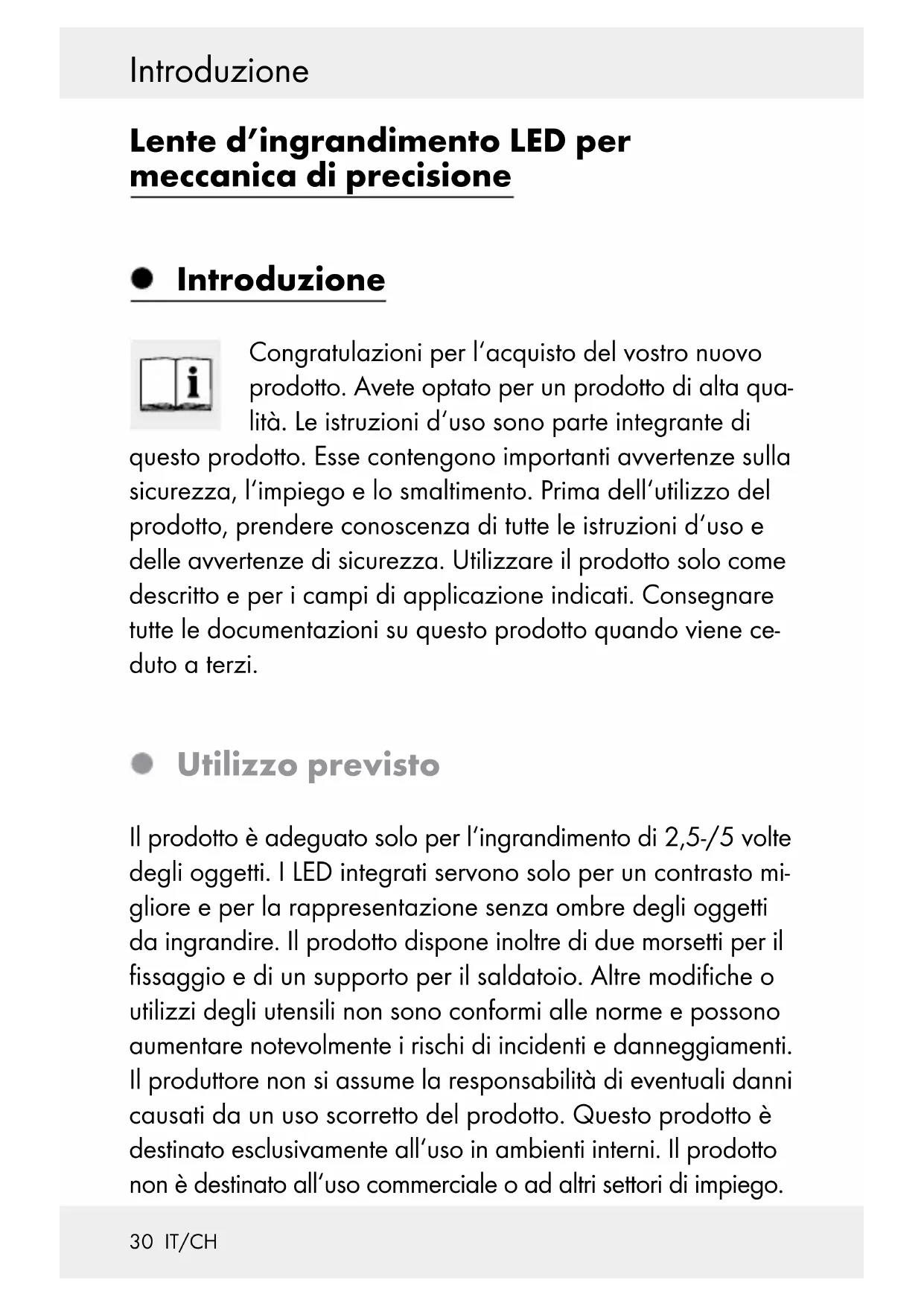+ 2,3653 X - 0,1595 Volume della fornitura Controllate il prodotto subito dopo averlo scartato e verificate che il volume della fornitura sia completo e le condizione del prodotto e di tutti gli altri pezzi siano impeccabili. Utilizzare il prodotto prima di assicurarsi che il volume di fornitura non sia completo. 1 lente d’ingrandimento LED per meccanica di precisione 3 batterie da 1,5 V , di tipo AAA 1 libretto d’istruzioni d’uso33 IT/CH Sicurezza Sicurezza Avvertenze generali di sicurezza CONSERVARE LE INDICAZIONI DI SICUREZZA E LE ISTRUZIONI PER EVENTUALI NECESSITÀ FUTURE! PERICOLO DI