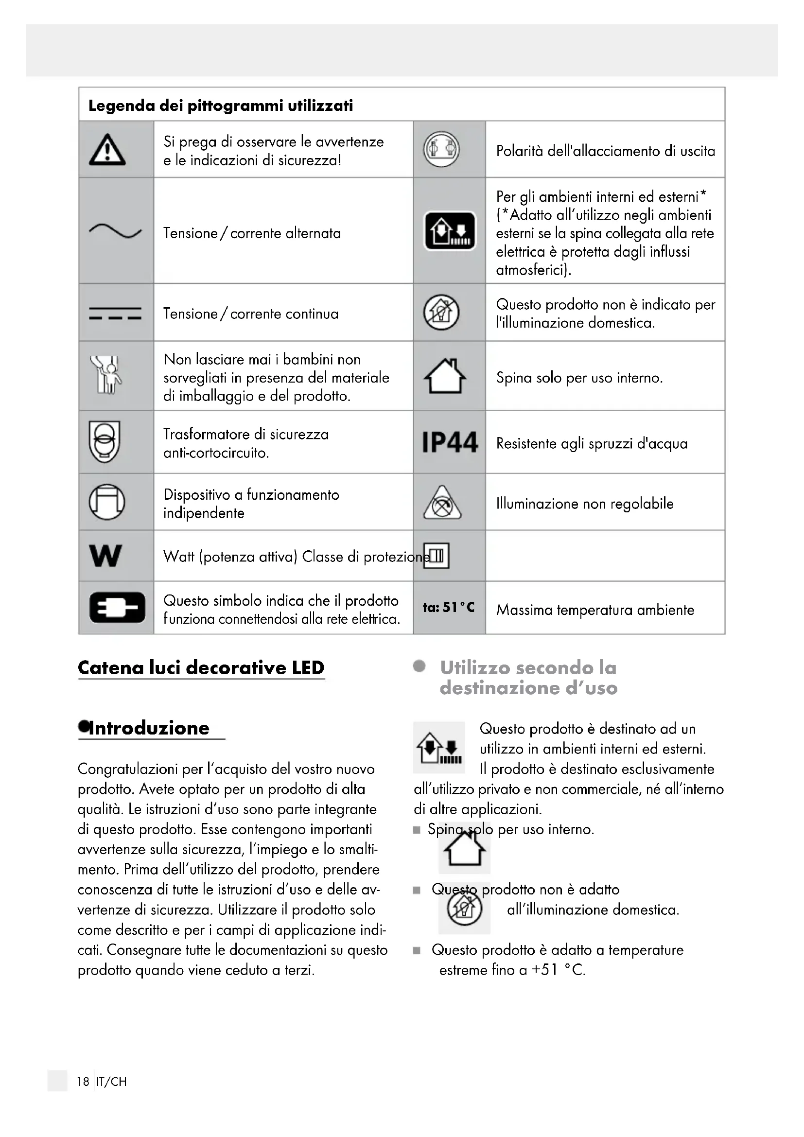 unziona connettendosi alla rete elett rica. ta: 51°C Massima temperatura ambiente Catena luci decorative LED Introduzione Congratulazioni per l‘acquisto del vostro nuovo prodotto. Avete optato per un prodotto di alta qualità. Le istruzioni d‘uso sono parte integrante di questo prodotto. Esse contengono importanti avvertenze sulla sicurezza, l‘impiego e lo smalti- mento. Prima dell‘utilizzo del prodotto, prendere conoscenza di tutte le istruzioni d‘uso e delle av- vertenze di sicurezza. Utilizzare il prodotto solo come descritto e per i campi di applicazione indi- cati. Consegnare tutte le documentazioni su questo prodotto quando viene ceduto a terzi. Utilizzo secondo la destinazione d’uso Questo prodotto è destinato ad un utilizzo in ambienti interni ed esterni. Il prodotto è destinato esclusivamente all‘utilizzo privato e non commerciale, né all‘interno di altre applicazioni. Spina solo per uso interno. Questo prodotto non è adatto all‘illuminazione domestica. Questo prodotto è adatto a temperature estreme fino a +51 °C.19 IT/CH Descrizione dei componenti