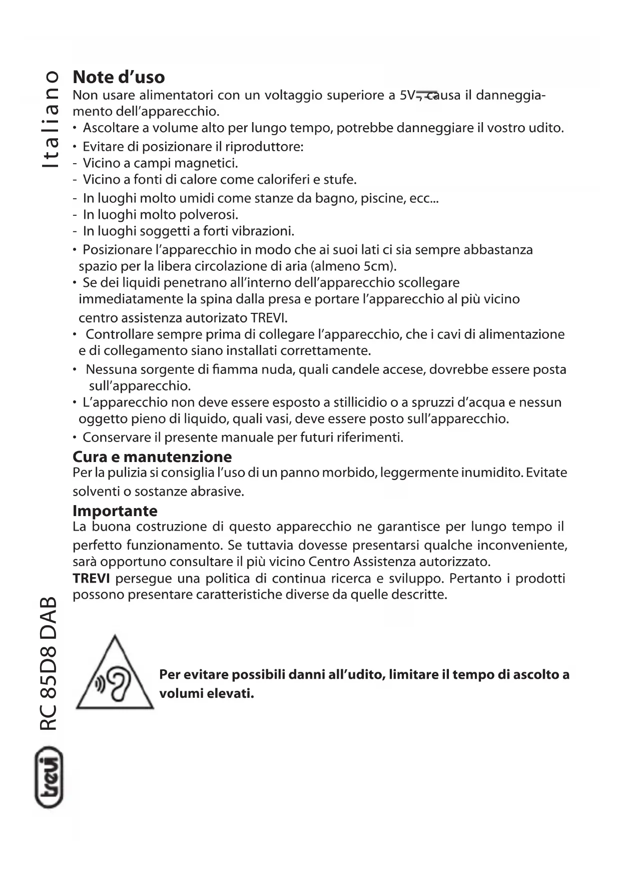 - Conservare il presente manuale per futuri riferimenti. Cura e manutenzione Per la pulizia si consiglia l’uso di un panno morbido, leggermente inumidito. Evitate solventi o sostanze abrasive. Importante La buona costruzione di questo apparecchio ne garantisce per lungo tempo il perfetto funzionamento. Se tuttavia dovesse presentarsi qualche inconveniente, sarà opportuno consultare il più vicino Centro Assistenza autorizzato. TREVI persegue una politica di continua ricerca e sviluppo. Pertanto i prodotti possono presentare caratteristiche diverse da quelle descritte. Italiano Per evitare possibili danni all’udito, limitare il tempo di ascolto a volumi elevati.RC 85D8 DAB