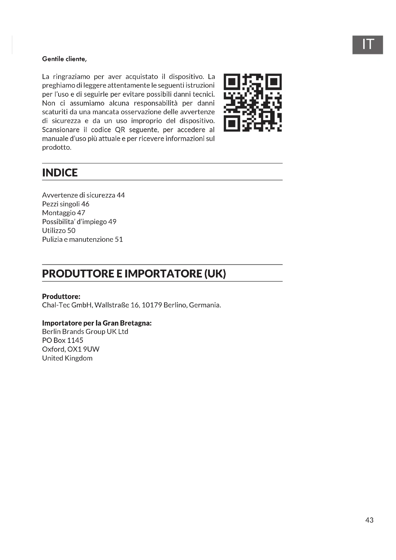 Gentile cliente, La ringraziamo per aver acquistato il dispositivo. La preghiamo di leggere attentamente le seguenti istruzioni per l’uso e di seguirle per evitare possibili danni tecnici. Non ci assumiamo alcuna responsabilità per danni scaturiti da una mancata osservazione delle avvertenze di sicurezza e da un uso improprio del dispositivo. Scansionare il codice QR seguente, per accedere al manuale d’uso più attuale e per ricevere informazioni sul prodotto. INDICE Avvertenze di sicurezza 44 Pezzi singoli 46 Montaggio 47 Possibilita’ d’impiego 49 Utilizzo 50 Pulizia e manutenzione 51 PRODUTTORE E IMPORTATORE (UK) Produttore: Chal-Tec GmbH, Wallstraße 16, 10179 Berlino, Germania. Importatore per la Gran Bretagna: Berlin Brands Group UK Ltd PO Box 1145 Oxford, OX1 9UW United Kingdom44