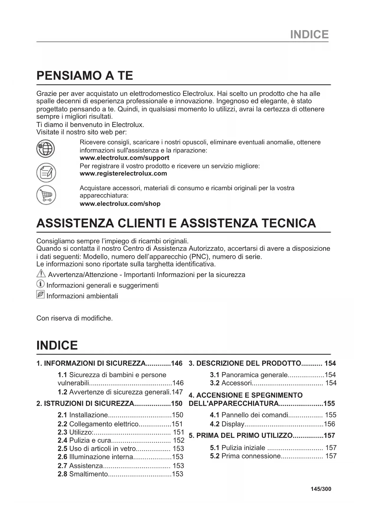 Grazie per aver acquistato un elettrodomestico Electrolux. Hai scelto un prodotto che ha alle spalle decenni di esperienza professionale e innovazione. Ingegnoso ed elegante, è stato progettato pensando a te. Quindi, in qualsiasi momento lo utilizzi, avrai la certezza di ottenere sempre i migliori risultati. Ti diamo il benvenuto in Electrolux. Visitate il nostro sito web per: Ricevere consigli, scaricare i nostri opuscoli, eliminare eventuali anomalie, ottenere informazioni sull'assistenza e la riparazione: www.electrolux.com/support Per registrare il vostro prodotto e ricevere un servizio migliore: www.registerelectrolux.com Acquistare accessori, materiali di consumo e ricambi originali per la vostra apparecchiatura: www.electrolux.com/shop