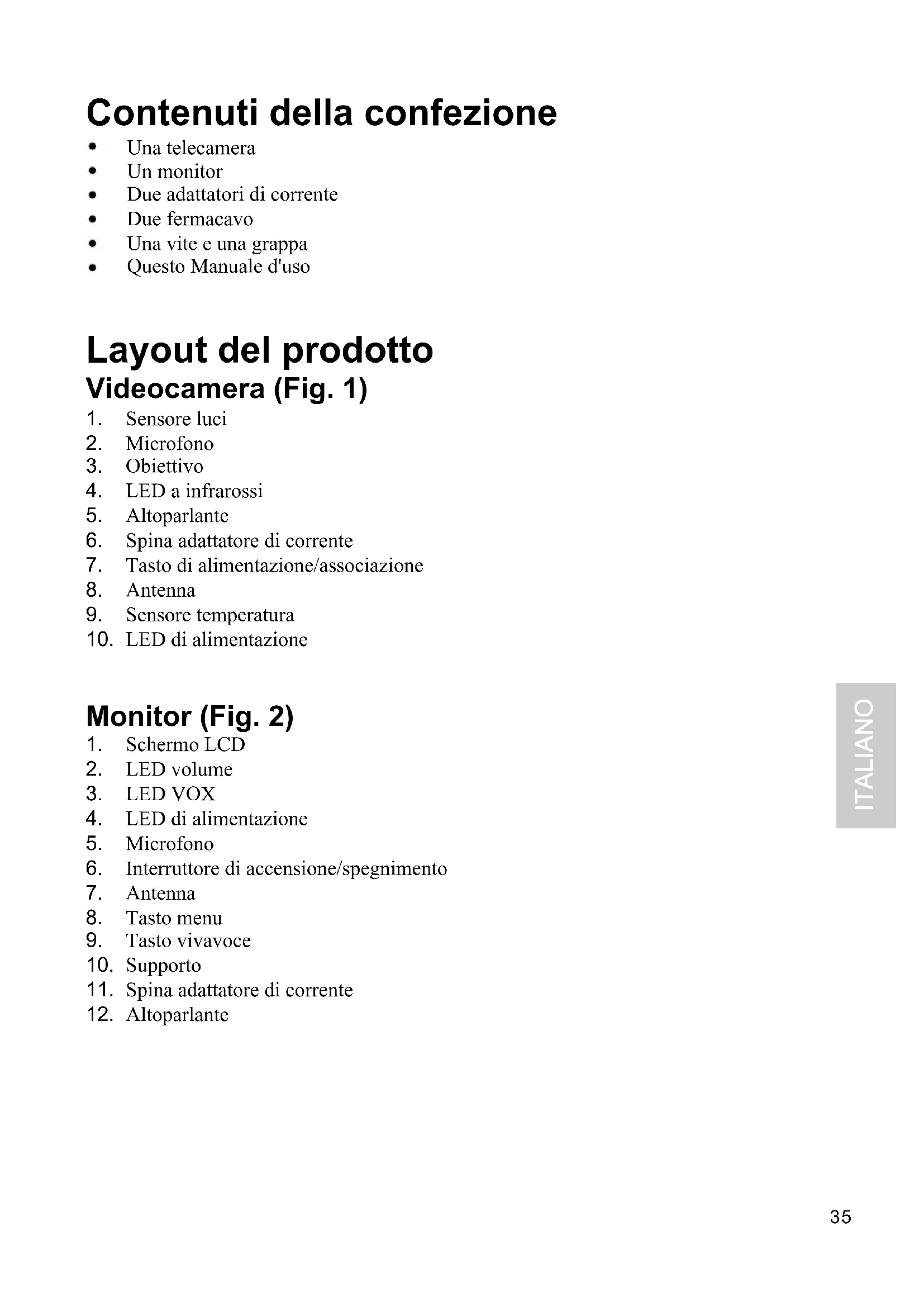 Contenuti della confezione Una telecamera Un monitor Due adattatori di corrente Due fermacavo Una vite e una grappa Questo Manuale d'uso Layout del prodotto Videocamera (Fig. 1)