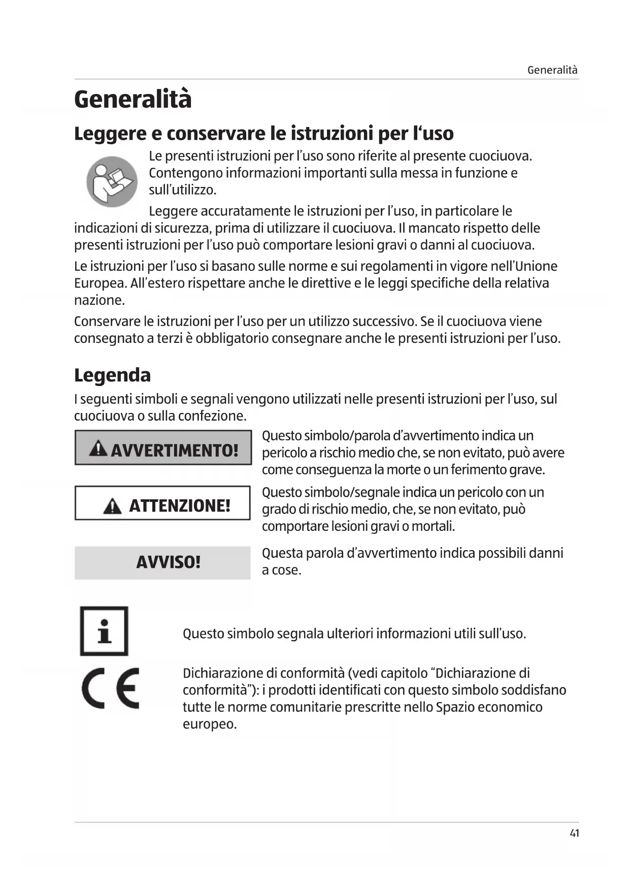 Generalità Leggere e conservare le istruzioni per l‘uso Le presenti istruzioni per l’uso sono riferite al presente cuociuova. Contengono informazioni importanti sulla messa in funzione e sull’utilizzo. Leggere accuratamente le istruzioni per l’uso, in particolare le indicazioni di sicurezza, prima di utilizzare il cuociuova. Il mancato rispetto delle presenti istruzioni per l’uso può comportare lesioni gravi o danni al cuociuova. Le istruzioni per l’uso si basano sulle norme e sui regolamenti in vigore nell’Unione Europea. All’estero rispettare anche le direttive e le leggi specifiche della relativa nazione. Conservare le istruzioni per l’uso per un utilizzo successivo. Se il cuociuova viene consegnato a terzi è obbligatorio consegnare anche le presenti istruzioni per l’uso. Legenda I seguenti simboli e segnali vengono utilizzati nelle presenti istruzioni per l’uso, sul cuociuova o sulla confezione. AVVERTIMENTO! Questo simbolo/parola d’avvertimento indica un pericolo a rischio medio che, se non evitato, può avere come conseguenza la morte o un ferimento grave. ATTENZIONE! Questo simbolo/segnale indica un pericolo con un grado di rischio medio, che, se non evitato, può comportare lesioni gravi o mortali. AVVISO! Questa parola d’avvertimento indica possibili danni a cose. Questo simbolo segnala ulteriori informazioni utili sull’uso. Dichiarazione di conformità (vedi capitolo “Dichiarazione di conformità”): i prodotti identificati con questo simbolo soddisfano tutte le norme comunitarie prescritte nello Spazio economico europeo. Buch_CH_Eierkocher.indb 41Buch_CH_Eierkocher.indb 41 20.09.2022 11:49:3220.09.2022 11:49:32Sicurezza