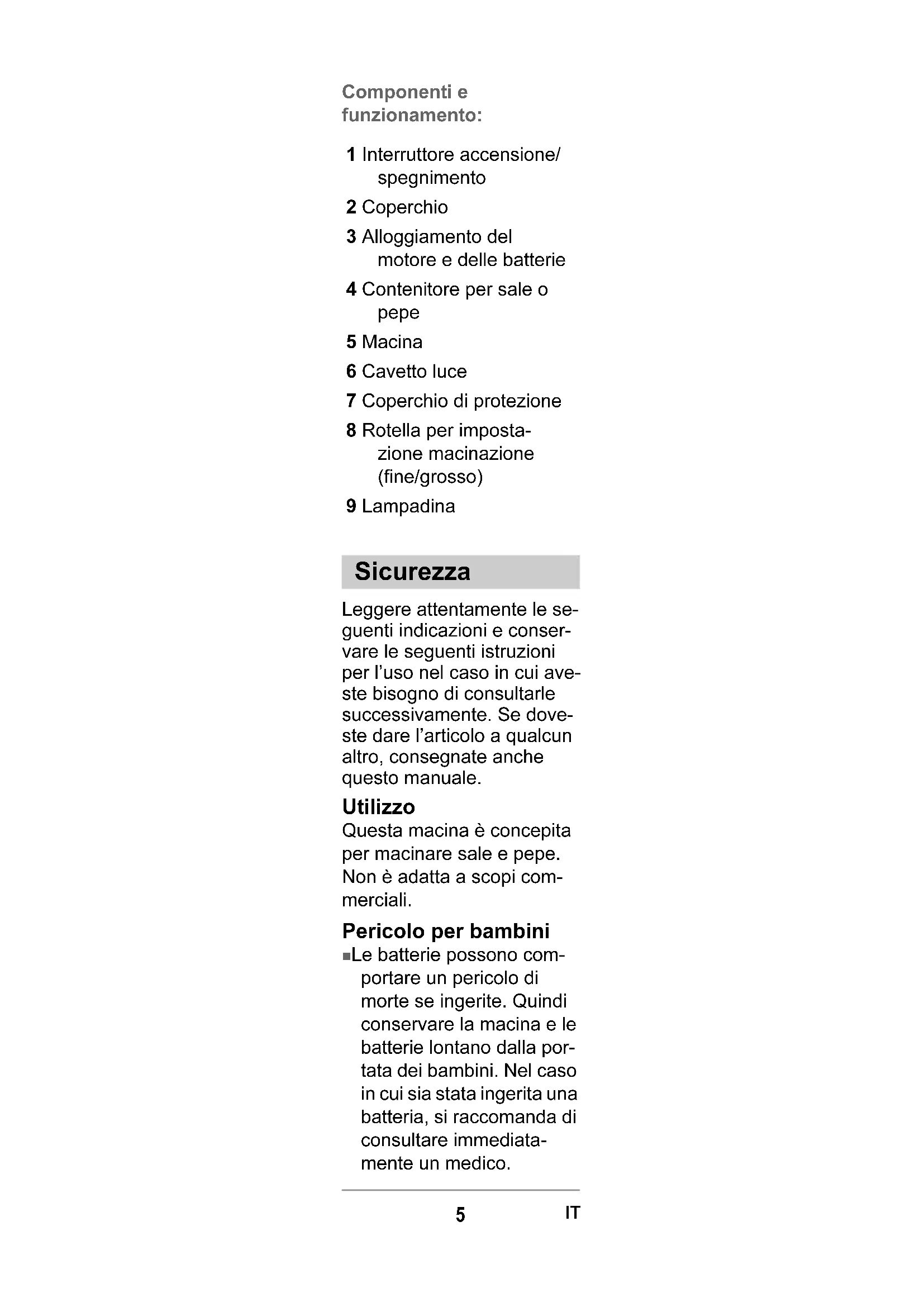 Sostituire sempre tutte le batterie contemporanea- mente. Non utilizzate bat- terie di differenti tipi, mar- che o di differente capa- cità. Non riempire il contenitore della macina fino all'orlo, ma lasciare circa 5 mm di spazio. L'umidità potrebbe provocare la dilatazione dei cristalli di sale, tanto da provocare la rottura del contenitore. Azionare la macina esclu- sivamente dopo averla ri- empita di sale o pepe. Non apportare nessuna modifica all'apparecchio. Lasciare eseguire even- tuali riparazioni esclusiva- mente in un'officina spe- cializzata e osservare le condizioni di garanzia. Non utilizzare mai deter- genti abrasivi o simili per pulire la macina. La super- ficie potrebbe restare graf- fiata.