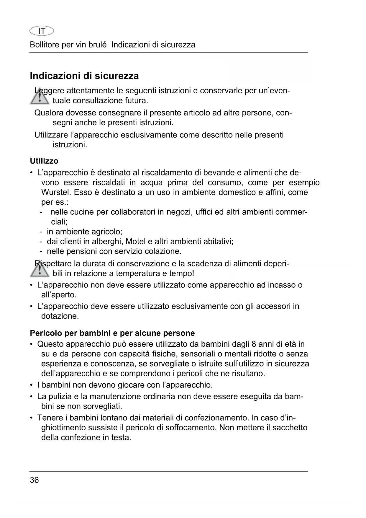 - Il bollitore per vin brulé non deve essere immerso in acqua o altri liquidi. Pericolo di folgorazione! Non utilizzato l'apparecchio in luoghi umidi o vicino, per es., a lavabi.