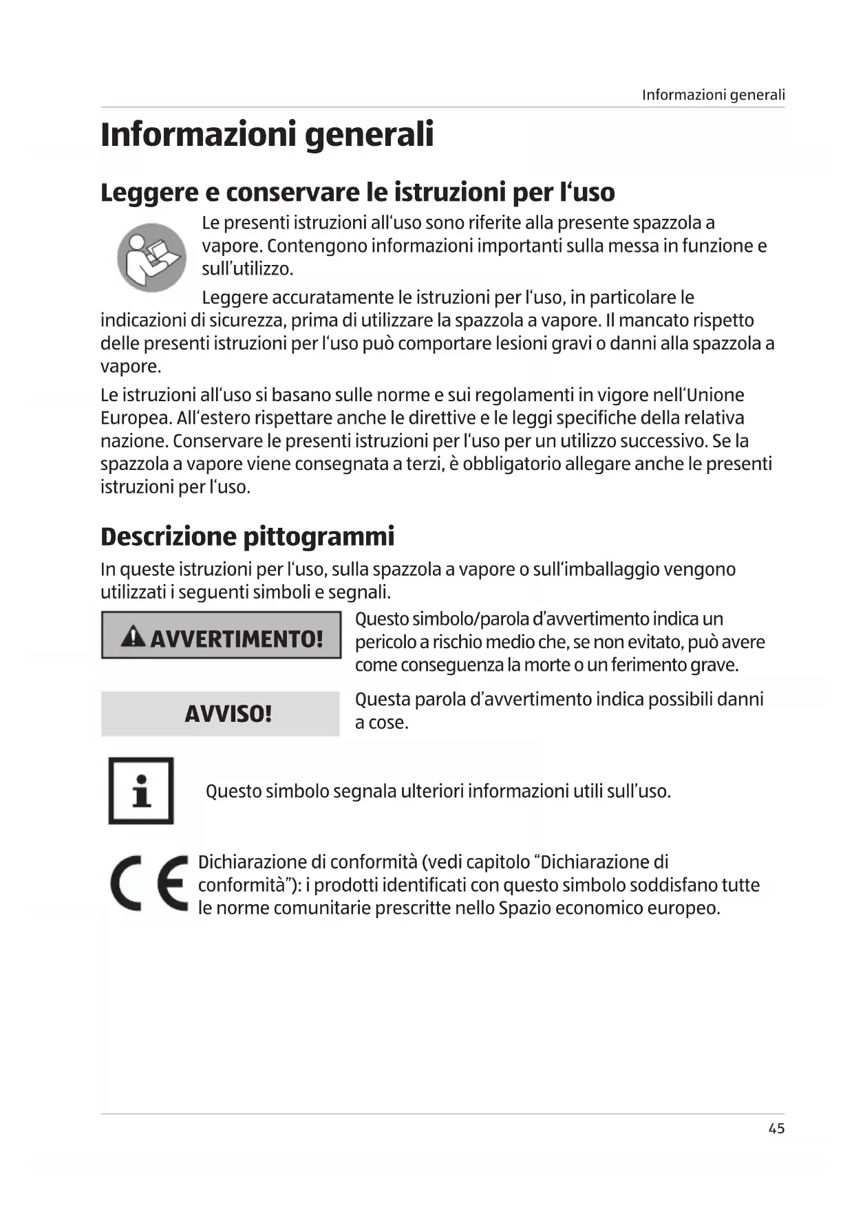 Informazioni generali Leggere e conservare le istruzioni per l‘uso Le presenti istruzioni all‘uso sono riferite alla presente spazzola a vapore. Contengono informazioni importanti sulla messa in funzione e sull’utilizzo. Leggere accuratamente le istruzioni per l‘uso, in particolare le indicazioni di sicurezza, prima di utilizzare la spazzola a vapore. Il mancato rispetto delle presenti istruzioni per l‘uso può comportare lesioni gravi o danni alla spazzola a vapore. Le istruzioni all‘uso si basano sulle norme e sui regolamenti in vigore nell‘Unione Europea. All‘estero rispettare anche le direttive e le leggi specifiche della relativa nazione. Conservare le presenti istruzioni per l‘uso per un utilizzo successivo. Se la spazzola a vapore viene consegnata a terzi, è obbligatorio allegare anche le presenti istruzioni per l‘uso. Descrizione pittogrammi In queste istruzioni per l‘uso, sulla spazzola a vapore o sull‘imballaggio vengono utilizzati i seguenti simboli e segnali. AVVERTIMENTO! Questo simbolo/parola d’avvertimento indica un pericolo a rischio medio che, se non evitato, può avere come conseguenza la morte o un ferimento grave. AVVISO! Questa parola d’avvertimento indica possibili danni a cose. Questo simbolo segnala ulteriori informazioni utili sull’uso. Dichiarazione di conformità (vedi capitolo “Dichiarazione di conformità”): i prodotti identificati con questo simbolo soddisfano tutte le norme comunitarie prescritte nello Spazio economico europeo. Buch_CH_Dampfbuerste Faltbar.indb 45Buch_CH_Dampfbuerste Faltbar.indb 45 16.04.2021 09:51:4016.04.2021 09:51:40Sicurezza