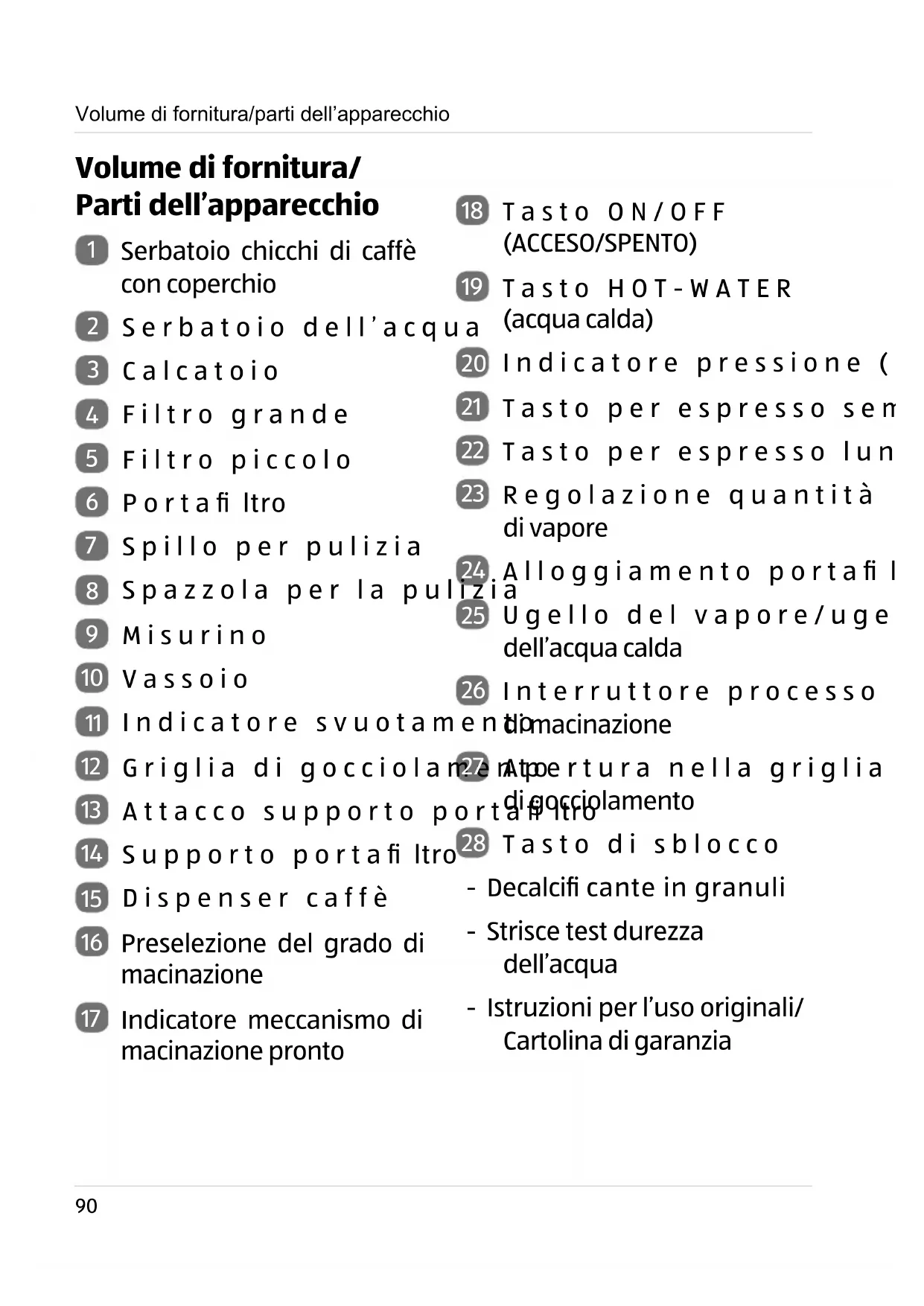 - Per le riparazioni devono essere utilizzati esclusivamente i com- ponenti corrispondenti ai dati originali dell’apparecchio. Nel- la macchina per caffè espresso si trovano componenti elettrici e meccanici indispensabili alla protezione dai pericoli.