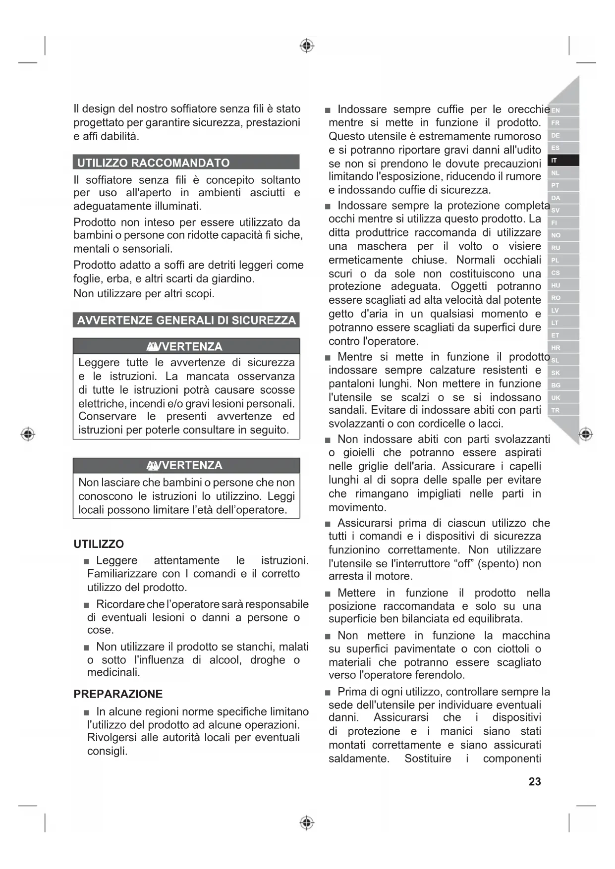 Il design del nostro soffi atore senza fi li è stato progettato per garantire sicurezza, prestazioni e affi dabilità. UTILIZZO RACCOMANDATO Il soffi atore senza fi li è concepito soltanto per uso all'aperto in ambienti asciutti e adeguatamente illuminati. Prodotto non inteso per essere utilizzato da bambini o persone con ridotte capacità fi siche, mentali o sensoriali. Prodotto adatto a soffi are detriti leggeri come foglie, erba, e altri scarti da giardino. Non utilizzare per altri scopi.
