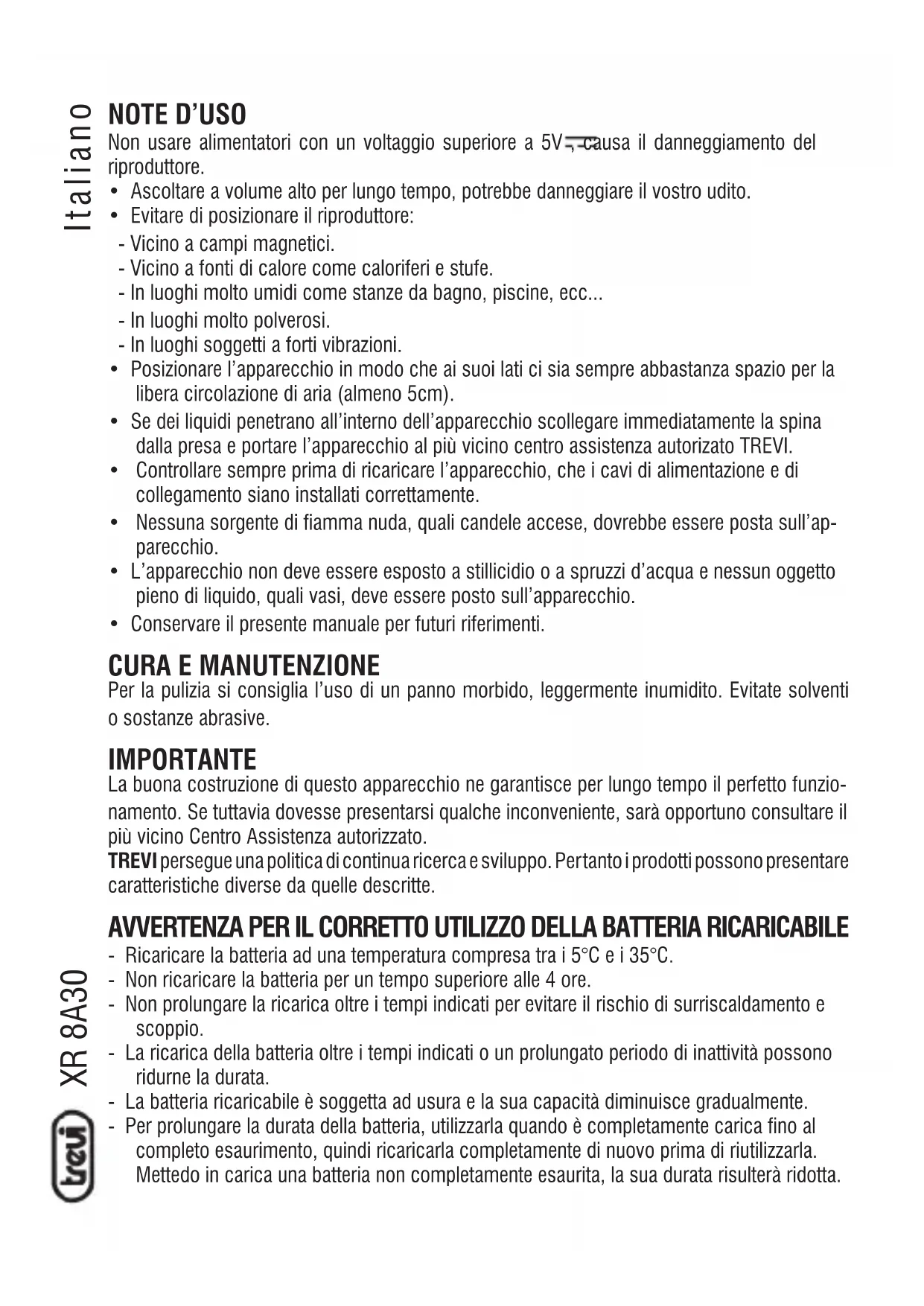 Per la pulizia si consiglia l’uso di un panno morbido, leggermente inumidito. Evitate solventi o sostanze abrasive. IMPORTANTE La buona costruzione di questo apparecchio ne garantisce per lungo tempo il perfetto funzio- namento. Se tuttavia dovesse presentarsi qualche inconveniente, sarà opportuno consultare il più vicino Centro Assistenza autorizzato. TREVI persegue una politica di continua ricerca e sviluppo. Pertanto i prodotti possono presentare caratteristiche diverse da quelle descritte. AVVERTENZA PER IL CORRETTO UTILIZZO DELLA BATTERIA RICARICABILE - Ricaricare la batteria ad una temperatura compresa tra i 5°C e i 35°C. - Non ricaricare la batteria per un tempo superiore alle 4 ore. - Non prolungare la ricarica oltre i tempi indicati per evitare il rischio di surriscaldamento e scoppio. - La ricarica della batteria oltre i tempi indicati o un prolungato periodo di inattività possono ridurne la durata. - La batteria ricaricabile è soggetta ad usura e la sua capacità diminuisce gradualmente. - Per prolungare la durata della batteria, utilizzarla quando è completamente carica fino al completo esaurimento, quindi ricaricarla completamente di nuovo prima di riutilizzarla. Mettedo in carica una batteria non completamente esaurita, la sua durata risulterà ridotta. ItalianoXR 8A30 In questo caso, ripetere il ciclo caricamento/scaricamento completo più volte. - Evitare di tenere la batteria sotto carica tutta la notte. DESCRIZIONE COMANDI Italiano