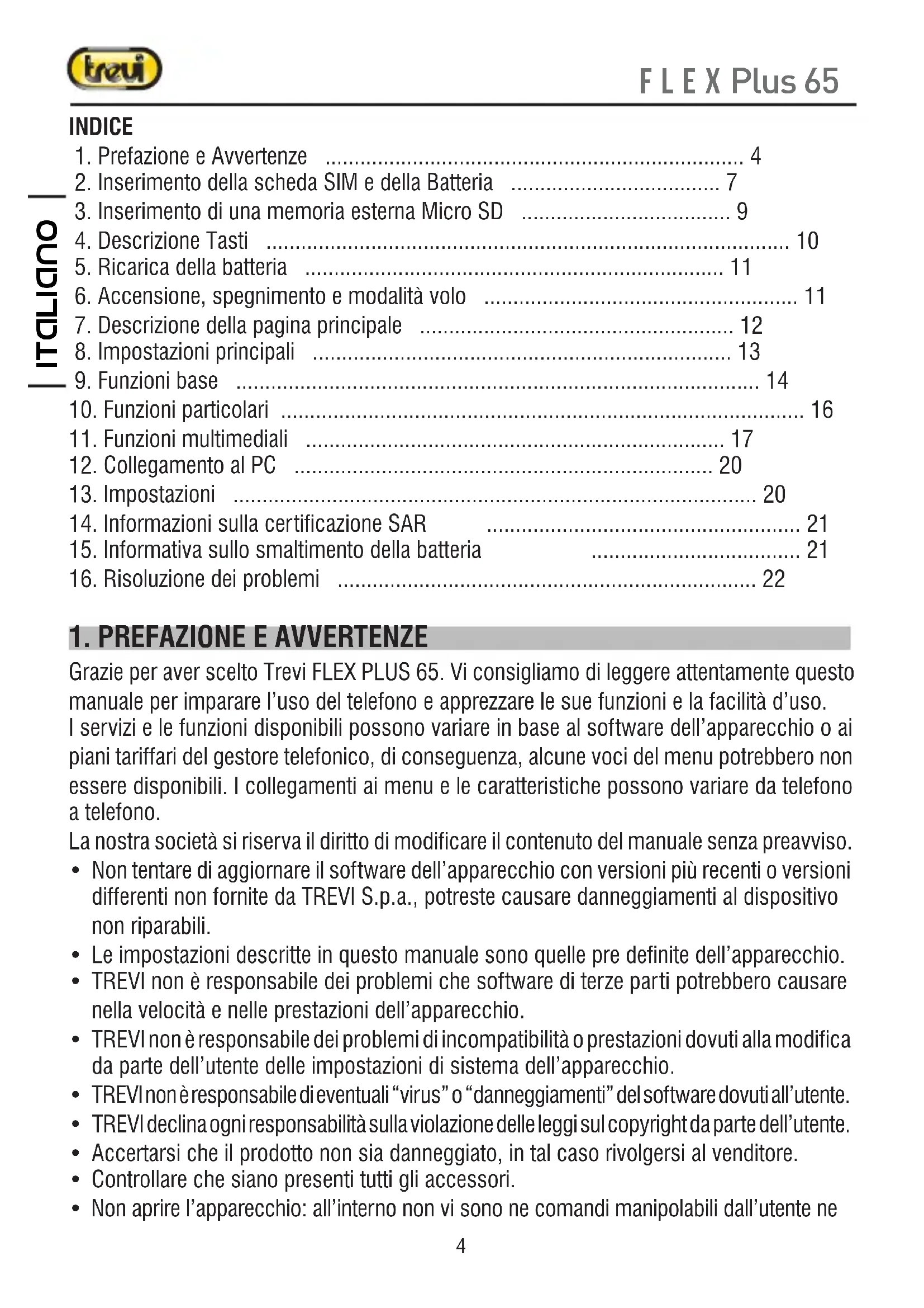 Grazie per aver scelto Trevi FLEX PLUS 65. Vi consigliamo di leggere attentamente questo manuale per imparare l’uso del telefono e apprezzare le sue funzioni e la facilità d’uso. I servizi e le funzioni disponibili possono variare in base al software dell’apparecchio o ai piani tariffari del gestore telefonico, di conseguenza, alcune voci del menu potrebbero non essere disponibili. I collegamenti ai menu e le caratteristiche possono variare da telefono a telefono. La nostra società si riserva il diritto di modificare il contenuto del manuale senza preavviso.