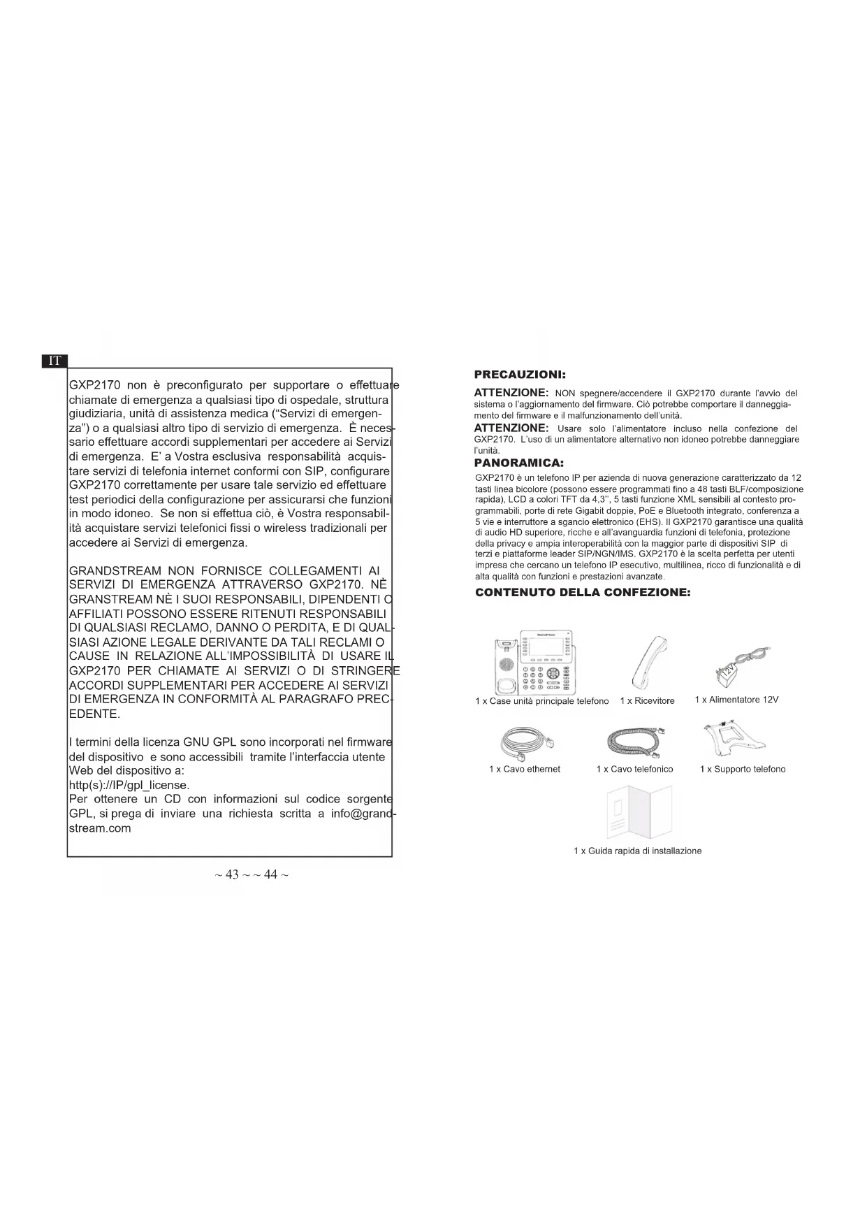 DI EMERGENZA IN CONFORMITÀ AL PARAGRAFO PREC- EDENTE. I termini della licenza GNU GPL sono incorporati nel rmware del dispositivo e sono accessibili tramite l’interfaccia utente Web del dispositivo a: http(s)://IP/gpl_license. Per ottenere un CD con informazioni sul codice sorgente GPL, si prega di inviare una richiesta scritta a info@grand- stream.com