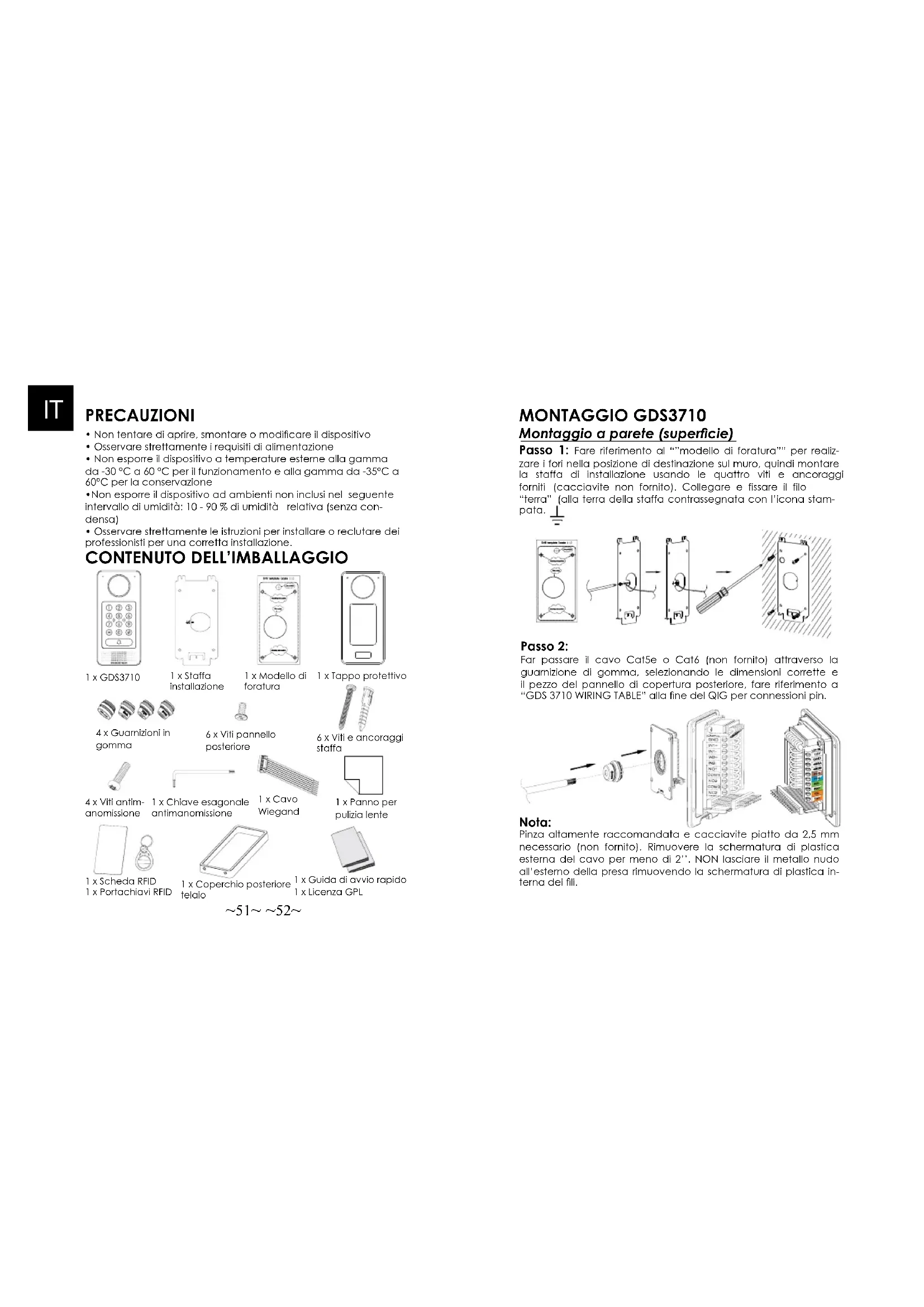 - Non tentare di aprire, smontare o modicare il dispositivo• Osservare strettamente i requisiti di alimentazione• Non esporre il dispositivo a temperature esterne alla gamma da -30 °C a 60 °C per il funzionamento e alla gamma da -35°C a 60°C per la conservazione•Non esporre il dispositivo ad ambienti non inclusi nel seguente intervallo di umidità: 10 - 90 % di umidità relativa (senza con-densa)• Osservare strettamente le istruzioni per installare o reclutare dei professionisti per una corretta installazione.1 x GDS37101 x Guida di avvio rapido1 x Licenza GPL1 x Staffa installazione1 x Scheda RFID1 x Portachiavi RFID4 x Guarnizioni in gomma6 x Viti e ancoraggi staffa6 x Viti pannello posteriore4 x Viti antim-anomissione1 x Chiave esagonale antimanomissione1 x Modello di foratura1 x Cavo Wiegand1 x Coperchio posteriore telaioPasso 2: Far passare il cavo Cat5e o Cat6 (non fornito) attraverso la guarnizione di gomma, selezionando le dimensioni corrette e il pezzo del pannello di copertura posteriore, fare riferimento a “GDS 3710 WIRING TABLE” alla ne del QIG per connessioni pin. MONTAGGIO GDS3710 Montaggio a parete (supercie) Passo 1: Fare riferimento al “”modello di foratura”” per realiz- zare i fori nella posizione di destinazione sul muro, quindi montare la staffa di installazione usando le quattro viti e ancoraggi forniti (cacciavite non fornito). Collegare e fissare il filo “terra” (alla terra della staffa contrassegnata con l’icona stam-pata. Pinza altamente raccomandata e cacciavite piatto da 2,5 mm necessario (non fornito). Rimuovere la schermatura di plastica esterna del cavo per meno di 2’’. NON lasciare il metallo nudo all’esterno della presa rimuovendo la schermatura di plastica in-terna dei li. Nota:1 x Panno per pulizia lente1 x Tappo protettivo~53~ ~54~ Passo 3: Assicurarsi che il pannello di copertura posteriore sia in posizione e che il pannello cablato posteriore sia a posto. Far scivolare il pannello posteriore su tutta la supercie posteriore del dispositivo, stringerlo usando le viti comprese. Passo 4: Togliere le due viti anti manomissione usando la chiave es-agonale fornita. Allineare con cautela il GDS3710 alla staffa sul muro, premere e tirare giù il GDS3710 nella posizione corretta. Passo 5: Installare le due viti posteriori anti manomissione usando la chiave esagonale fornita (non stringere troppo le viti). Coprire i due buchi delle viti in fondo al pannello di copertura posteriore usando i due componenti di silicone forniti. Controllare e nire l’installazione. Montaggio a parete (incassato) Fare riferimento al relativo “Kit montaggio a parete (incassato)” che può essere acquistato separatamente da Grandstream.
