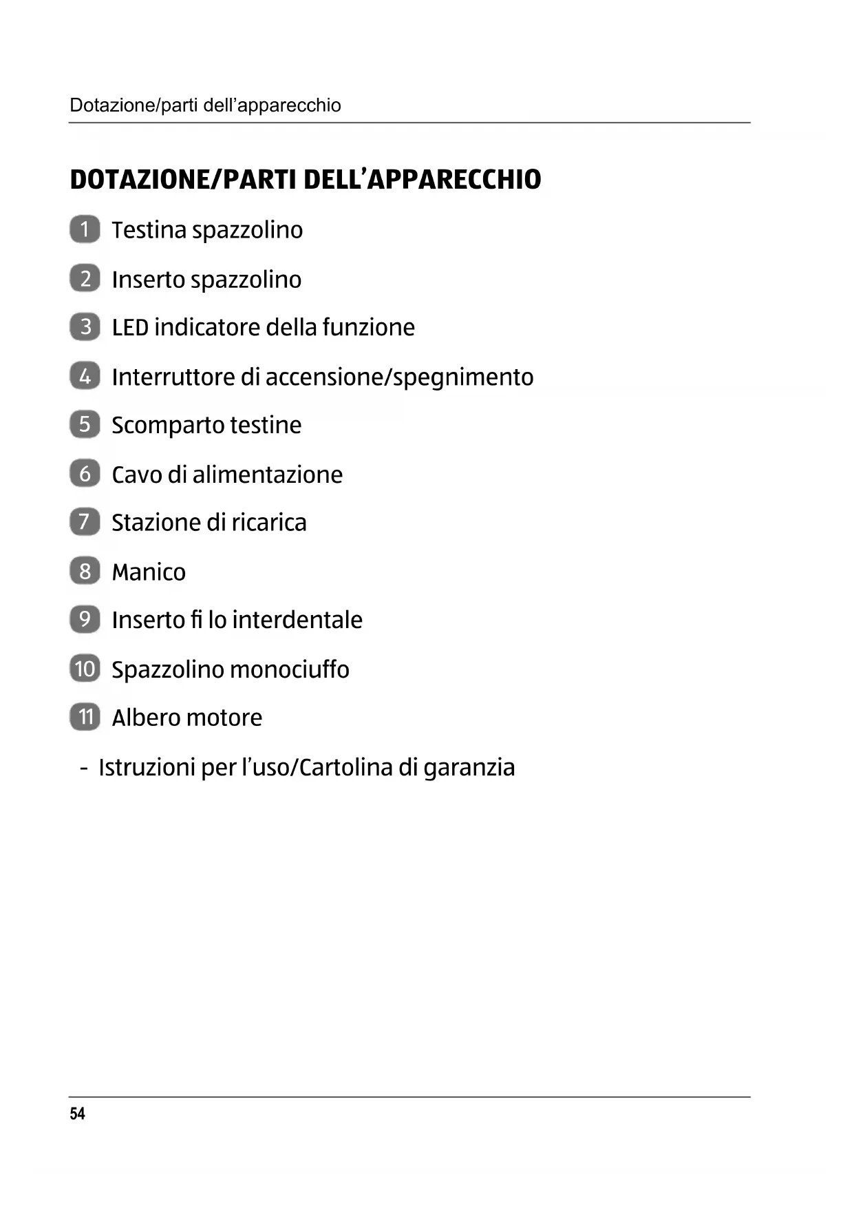 Albero motore - Istruzioni per l’uso/Cartolina di garanzia Dotazione/parti dell’apparecchio55 IN GENERALE Leggere e conservare le istruzioni per l’uso Le presenti istruzioni per l’uso si riferiscono al presente spazzolino da denti a ultrasuoni a batteria (di seguito chiamato solo “spazzolino da denti”). Contengono infor- mazioni importanti relative alla messa in funzione e all’utilizzo. Prima di mettere in funzione lo spazzolino da denti leggere atten- tamente le istruzioni per l’uso, in particolar modo le note relative alla sicurezza. Il mancato rispetto delle presenti istruzioni per l’uso può provocare ferimenti gravi o danni allo spazzolino da denti. Le istruzioni per l’uso si basano sulle normative e regole vigenti nell’Unione Europea. All’estero rispettare anche linee guida e nor- mative nazionali. Conservare le istruzioni per l’uso per usi futuri. In caso di cessione dello spazzolino da denti, consegnare anche le istruzioni per l’uso. Descrizione pittogrammi Nelle istruzioni per l’uso, sullo spazzolino da denti o sull’imbal- laggio sono riportati i seguenti pittogrammi e le seguenti parole d’avvertimento. AVVERTENZA! Questo simbolo/parola d’avvertimento indica un pericolo a rischio medio che, se non evitato, può avere come conseguenza la morte o un ferimento grave. ATTENZIONE! Questo simbolo/parola d’avvertimento indica un pericolo a basso rischio che, se non evitato, può avere come conseguenza un ferimento lieve o medio. In generale56 Sicurezza AVVISO! Questo parola d’avvertimento indica la possibilità di danni. Questo simbolo dà utili informazioni aggiuntive sul mon- taggio o sull’utilizzo. Dichiarazione di conformità (vedi capitolo “Dichiarazio- ne di conformità”): I prodotti identifi cati con questo simbolo soddisfano tutte le norme comunitarie appli- cabili nello Spazio economico europeo. Il sigillo “Sicurezza testata” conferma che la stazione di ricari- ca di questo spazzolino da denti è sicuro in condi- zioni di uso prevedibili. Il marchio di verifi ca conferma la conformità con la legge relativa alla sicurezza dei prodotti. Grado di protezione IP67: protezione totale alla penetrazione di polveri e contro il contatto con elementi che conducono corrente elettrica. Tenuta all’acqua temporanea (30 minuti a 1 metro di pro- fondità a pressione ambiente). Classe di protezione II / (base di ricarica): apparecchi elettrici con isolamento doppio o rafforzato tra circuito elettrico e tensione di uscita. SICUREZZA Utilizzo conforme alla destinazione d’uso Lo spazzolino da denti è stato concepito esclusivamente per pulire i denti. E’ destinato esclusivamente all’uso in ambito privato e non in ambito professionale.57 Utilizzare lo spazzolino da denti esclusivamente come descritto nelle presenti istruzio- ni per l’uso. Ogni altro utilizzo è da inten- dersi come non conforme alla destinazione d’uso e può provocare danni a cose se non addirittura a persone. Lo spazzolino da denti non è un giocattolo per bambini. Il produttore o rivenditore non si assume alcuna responsabilità per i danni dovuti all’uso non conforme alla destinazione o all’uso scorretto. Note relative alla sicurezza AVVERTENZA! Pericolo di scosse elettriche! La scorretta installazione elettrica o l’eccessiva tensione di rete pos- sono provocare scosse elettriche. − Allacciare la stazione di ricarica solo se la tensione di rete della presa di corrente corrisponde ai dati riportati sulla targhetta. − Il cavo di alimentazione della stazione di ricarica non può esse- re sostituito. Smaltire la stazione di ricarica se danneggiata. − Allacciare la stazione di ricarica solo a una presa di corrente ac- cessibile in modo tale che, in caso di malfunzionamento, essa possa essere velocemente staccata dalla rete elettrica. − Utilizzare lo spazzolino da denti solo in ambienti chiusi. − Non apportare modifi che allo spazzolino da denti o al cavo di alimentazione. − Non utilizzare lo spazzolino da denti e la base di ricarica se mo- strano danni evidenti o se il cavo di alimentazione o l’alimenta- tore sono difettosi per evitare pericoli. Sicurezza58 − Far eseguire le riparazioni a professionisti. Rivolgersi ad un’of- fi cina specializzata. In caso di riparazioni eseguite in pro- prio, allacciamento non corretto o errato utilizzo, si escludono re- sponsabilità e diritti di garanzia. − Per le riparazioni, utilizzare solo componenti che siano corri- spondenti alle specifi che originali dell’apparecchio. In questo spazzolino da denti si trovano parti elettriche e meccaniche che sono indispensabili per la protezione da fonti di pericolo. − Non è consentito far funzionare la stazione di ricarica con un timer esterno o sistemi di attivazione a distanza separati. − L’uso di elettrodomestici a contatto con i liquidi richiede la mas- sima cautela. − Mai immergere in acqua o altri liquidi la stazione di ricarica, il cavo di alimentazione o la spina. La stazione di ricarica non deve essere esposta a schizzi o liquidi. − Mai toccare la spina con le mani umide. − Mai tirare la spina dalla presa afferrando il cavo di alimentazio- ne, bensì afferrare sempre la spina di alimentazione. − Tenere la stazione di ricarica, lo spazzolino da denti, la spina o il cavo di alimentazione al di fuori dalla portata da fi amme libere e superfi ci roventi. − Non piegare il cavo di alimentazione e non farlo passare su spi- goli vivi. − Non riporre mai lo spazzolino da denti e la stazione di ricarica in posizione tale che possano cadere in una vasca o in un lavandino. − Non toccare mai con le mani gli apparecchi elettrici caduti in ac- qua. In tale eventualità sfi lare subito la spina. − Non servirsi mai del cavo di alimentazione per trasportare l’ap- parecchio. Sicurezza59 − Fare in modo che bambini non possano infi lare oggetti nella stazione di ricarica o nel manico. − Caricare lo spazzolino da denti solo con la stazione di ricarica in 