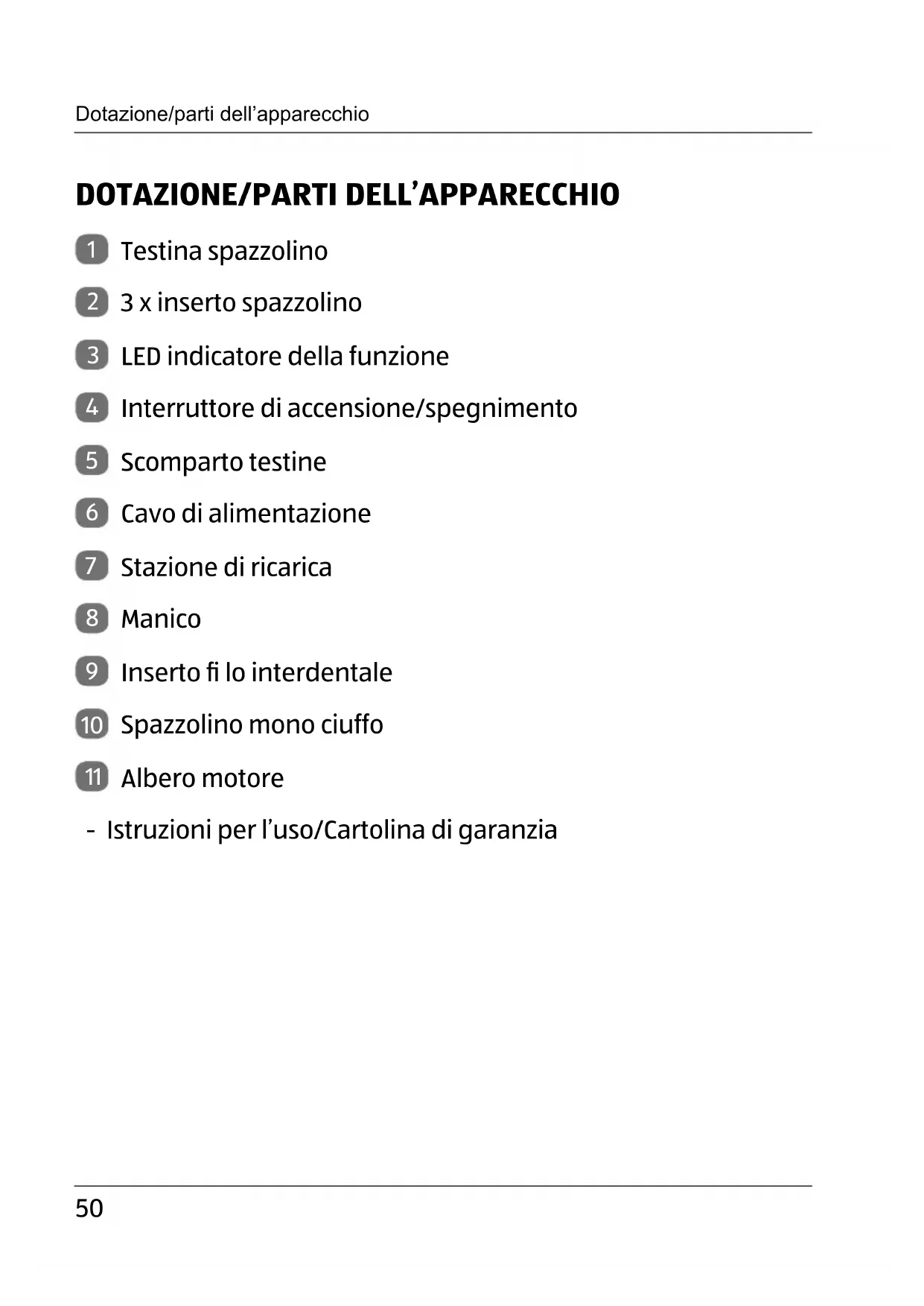 Albero motore - Istruzioni per l’uso/Cartolina di garanzia Dotazione/parti dell’apparecchio51 IN GENERALE Leggere e conservare le istruzioni per l’uso Le presenti istruzioni per l’uso si riferiscono al presente spazzolino da denti a ultrasuoni a batteria (di seguito chiamato solo “spazzolino da denti”). Contengono infor- mazioni importanti relative alla messa in funzione e all’utilizzo. Prima di mettere in funzione lo spazzolino da denti leggere atten- tamente le istruzioni per l’uso, in particolar modo le note relative alla sicurezza. Il mancato rispetto delle presenti istruzioni per l’uso può provocare ferimenti gravi o danni allo spazzolino da denti. Le istruzioni per l’uso si basano sulle normative e regole vigenti nell’Unione Europea. All’estero rispettare anche linee guida e nor- mative nazionali. Conservare le istruzioni per l’uso per usi futuri. In caso di cessione dello spazzolino da denti, consegnare anche le istruzioni per l’uso. DESCRIZIONE PITTOGRAMMI Nelle istruzioni per l’uso, sullo spazzolino da denti o sull’imbal- laggio sono riportati i seguenti pittogrammi e le seguenti parole d’avvertimento. AVVERTENZA! Questo simbolo/parola d’avvertimento indica un pericolo a rischio medio che, se non evitato, può avere come conseguenza la morte o un ferimento grave. ATTENZIONE! Questo simbolo/parola d’avvertimento indica un pericolo a basso rischio che, se non evitato, può avere come conseguenza un ferimento lieve o medio. In generale / Descrizione pittogrammi52 Sicurezza AVVISO! Questo parola d’avvertimento indica la possibilità di danni. Questo simbolo dà utili informazioni aggiuntive sul mon- taggio o sull’utilizzo. Dichiarazione di conformità (vedi capitolo “Dichiarazio- ne di conformità”): I prodotti identifi cati con questo simbolo soddisfano tutte le norme comunitarie appli- cabili nello Spazio economico europeo. Il sigillo “Sicurezza testata” conferma che la stazione di ricarica di questo spazzolino da denti è sicuro in condi- zioni di uso prevedibili. Il marchio di verifi ca conferma la conformità con la legge relativa alla sicurezza dei prodotti. IP67 Grado di protezione IP67: protezione totale alla penetrazio- ne di polveri e contro il contatto con elementi che conducono corrente elettrica. Protetto contro l’azione dell’acqua in caso di immersione temporanea. Classe di protezione II / (base di ricarica): apparecchi elettrici con isolamento doppio o rafforzato tra circuito elettrico e tensione di uscita. SICUREZZA Utilizzo conforme alla destinazione d’uso Lo spazzolino da denti è stato concepito esclusivamente per pulire i denti. E’ destinato esclusivamente all’uso in ambito privato e non in ambito professionale.53 Utilizzare lo spazzolino da denti esclusivamente come descritto nelle presenti istruzioni per l’uso. Ogni altro utilizzo è da inten- dersi come non conforme alla destinazione d’uso e può provocare danni a cose se non addirittura a persone. Lo spazzolino da denti non è un giocattolo per bambini. Il produttore o rivenditore non si assume alcuna responsabilità per i danni dovuti all’uso non conforme alla destinazione o all’uso scorretto. Note relative alla sicurezza AVVERTENZA! Pericolo di scosse elettriche! La scorretta installazione elettrica o l’eccessiva tensione di rete possono provocare scosse elettriche. − Allacciare la stazione di ricarica solo se la tensione di rete della presa di corrente corrisponde ai dati riportati sulla targhetta. − Il cavo di alimentazione della stazione di ricarica non può esse- re sostituito. Smaltire la stazione di ricarica se danneggiata. − Allacciare la stazione di ricarica solo a una presa di corrente ac- cessibile in modo tale che, in caso di malfunzionamento, essa possa essere velocemente staccata dalla rete elettrica. − Utilizzare lo spazzolino da denti solo in ambienti chiusi. − Non apportare modifi che allo spazzolino da denti o al cavo di alimentazione. − Non utilizzare lo spazzolino da denti e la base di ricarica se mo- strano danni evidenti o se il cavo di alimentazione o l’alimenta- tore sono difettosi per evitare pericoli. Sicurezza54 − Far eseguire le riparazioni a professionisti. Rivolgersi ad un’offi - cina specializzata. In caso di riparazioni eseguite in proprio, al- lacciamento non corretto o errato utilizzo, si escludono respon- sabilità e diritti di garanzia. − Per le riparazioni, utilizzare solo componenti che siano corri- spondenti alle specifi che originali dell’apparecchio. In questo spazzolino da denti si trovano parti elettriche e meccaniche che sono indispensabili per la protezione da fonti di pericolo. − Non è consentito far funzionare la stazione di ricarica con un timer esterno o sistemi di attivazione a distanza separati. − L’uso di elettrodomestici a contatto con i liquidi richiede la mas- sima cautela. − Mai immergere in acqua o altri liquidi la stazione di ricarica, il cavo di alimentazione o la spina. − Mai toccare la spina con le mani umide. − Mai tirare la spina dalla presa afferrando il cavo di alimentazio- ne, bensì afferrare sempre la spina di alimentazione. − Tenere la stazione di ricarica, lo spazzolino da denti, la spina o il cavo di alimentazione al di fuori dalla portata da fi amme libere e superfi ci roventi. − Non piegare il cavo di alimentazione e non farlo passare su spi- goli vivi. − Non riporre mai lo spazzolino da denti e la stazione di ricarica in posizione tale che possano cadere in una vasca o in un lavandino. − Non toccare mai con le mani gli apparecchi elettrici caduti in ac- qua. In tale eventualità sfi lare subito la spina. − Non servirsi mai del cavo di alimentazione per trasportare l’ap- parecchio. Sicurezza55 − Fare in modo che bambini non possano infi lare oggetti nella stazione di ricarica o nel manico. − Caricare lo spazzolino da denti solo con la stazione di ricarica in dotazione. − Staccare la stazione di ricarica dalla presa