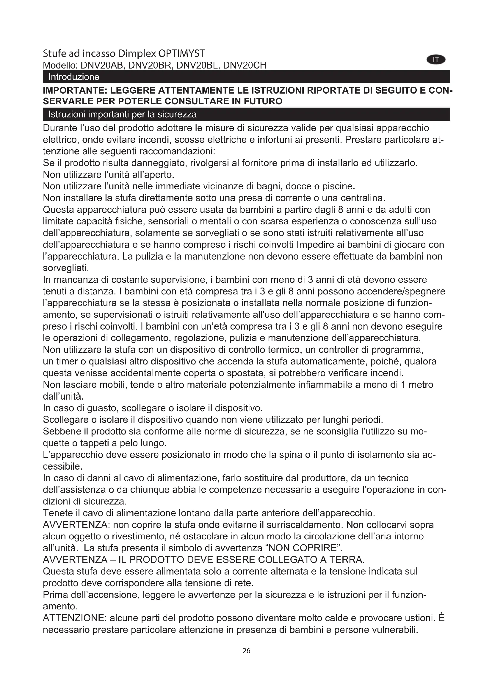 Funzionamento del telecomando Sul pannello di controllo, anché il telecomando funzioni, l’interruttore A (vedere Fig. 2) deve essere sulla posizione “ON” ( I ). Sul teleco- mando sono presenti 3 pulsanti (vedere Fig. 7). Per poter funzionare correttamente, il telecomando deve essere puntato verso l’eetto di combustione anteriore (vedere Fig. 12). Le funzioni del telecomando sono le seguenti: Premere una volta per attivaresolo l’eetto amma. Verrà segnalato dall’emissione di un beep. Premere una volta per attivareMetàcalore ed eetto amma. L’attivazione verrà indicata dall’emissione di due segnali acustici. Premere nuovamente per attivare il calore massimo e l’eetto amma. L’attivazione verrà segnalata dall’emissione di tre segnali acustici. Standby Verrà segnalato dall’emissione di un beep. Riciclaggio. Al termine della durata funzionale delle apparecchiature elettriche, il prodotto non deve essere smaltito con i riuti domestici. Devono invece essere smaltiti nelle apposite strutture. Per informazioni sui servizi di riciclaggio locali, rivolgersi all’amministrazione locale o al proprio rivenditore di ducia. Servizio di assistenza clienti. Il prodotto è garantito per due anni a partire dalla data d’acquisto. In questo arco di tempo ci impegniamo a riparare o sostituire il prodotto senza alcun addebito al cliente (salvo le lampadine e soggetto a disponibilità) purché sia stato installato e utilizzato in modo appropriato. I diritti riconosciuti dalla presente garanzia si aggiungono ai diritti di legge dell’acquirente, senza limitarli in alcun modo. Per informazioni o assistenza post-vendita su questo prodotto, consultare la garanzia sulla pagina posteriore, in cui è indicato il numero di telefono del nostro helpdesk. Sono inoltre disponibili parti di ricambio. Conservare la ricevuta o lo scontrino come prova di acquisto. Brevetto/Domanda di brevetto I prodotti della linea Optimyst sono tutelati da uno o più dei seguenti brevetti e richieste di brevetto: Gran Bretagna GB 2402206, GB 2460259, GB 2460453 , GB 2418014, GB 2465738, GB 2449925, GB 2465537 , GB 2455277 , GB1020534.2, GB1020537.5, GB1110987.3 Stati Uniti US 7967690, US 2010299980, US 2011062250, US 2008028648, US 13/167,042 Russia RU2008140317 Europa EP 2029941, EP 2201301, EP 2315976, EP 1787063, EP07723217.1 , EP11170434.2, EP 11170435.9 Cina CN 101883953, CN 200980128666.2, CN 101057105, CN 101438104 Australia AU 2009248743, AU 2007224634 Canada CA 2725214, CA 2579444, CA 2645939 Richiesta di brevetto internazionale WO 2006027272 Sud Africa ZA 200808702 Messico MX 2008011712 Corea KR 20080113235 Giappone JP 2009529649 Brasile BR P10708894-9 India IN 4122/KOLNP/2008 Nuova Zelanda NZ 571900 30Risoluzione dei problemi Sintomo Causa Azione correttiva L'eetto amma non parte. Il cavo della corrente non è collegato. Basso livello dell'acqua. Il connettore a bassa tensione non è collegato correttamente (vedere Fig. 7). L'unità trasduttore non risiede correttamente nella vasca di raccolta secondo le istruzioni fornite nella. Vericare che la spina sia correttamente colle- gata alla presa della corrente. Vericare che il serbatoio dell'acqua sia pieno e che sia presente dell'acqua nella vasca di rac- colta. Vericare che il connettore sia inserito corretta- mente (vedere Fig. 7). Accertarsi che il trasduttore risieda nel vano sagomato della vasca di raccolta. L'eetto amma è troppo basso. La manopola di controllo dell'eetto amma è posizionata su un livello troppo basso (vedere Fig. 2). Il disco in metallo del trasduttore potrebbe es- sere sporco (vedere Fig. 12). Il lo dell'Unità trasduttore è sopra il disco di metallo. Aumentare il livello della amma ruotando lentamente la manopola di controllo “D” in senso antiorario (vedere Fig. 2). Pulire il disco di metallo con la spazzola morbida in dotazione (vedere Fig. 12). Vedere “Manuten- zione” per una procedura passo per passo. Indirizzare il lo verso il retro della vasca di rac- colta e accertarsi che risieda nella scanalatura laterale che esce dalla vasca. Durante l'uso dell'unità si produce un odore sgradevole. Acqua sporca o stagnante. È stata usata acqua di rubinetto non ltrata. Pulire l'unità come descritto nella sezione Ma- nutenzione. Usare solo acqua di rubinetto ltrata. L'eetto amma ha troppo fumo. L'impostazione dell'eetto amma è troppo alta. Ruotare la manopola di controllo dell'eetto amma C in senso orario di circa ¼ di giro per volta. Dare al generatore di amma il tempo di regolarsi alla nuova impostazione (vedere Fig. 2). Le lampadine principali non funzionano e non c'è né amma né fumo. Non c'è acqua nel serbatoio. Seguire le istruzioni nella sezione Manutenzione, “Riempimento del serbatoio dell'acqua”. Vericare che la spina sia collegata corretta- mente alla presa e che l'Interruttore “A” Fig. 2 sia nella posizione “ON” ( I ). 31Chimenea empotrada Dimplex Opti-myst Modelo: DNV20AB, DNV20BR, DNV20BL, DNV20CH IMPORTANTE: ESTAS INSTRUCCIONES DEBEN LEERSE DETENIDAMENTE Y GUARDARSE PARA SU CONSULTA Al utilizar aparatos eléctricos siempre deben tomarse precauciones básicas para reducir el riesgo de incendio, descarga eléctrica y lesiones corporales, incluyendo lo siguiente: Si el aparato está dañado, consulte al proveedor antes de su instalación y uso. No lo utilice en el exterior. No lo utilice en el entorno inmediato de un baño, ducha o piscina. No sitúe el aparato inmediatamente debajo de una salida ja de enchufe o caja de conexión. Este aparato puede ser utilizado por niños a partir de 8 años y por personas con aptitudes físicas, sensoriales o mentales limitadas o sin experiencia ni conocimiento siempre que estén supervisados o se les haya indicado el uso del aparato de forma segura y comprendan los peligros relacionados. Los niños no deben jugar con el aparato. La limpieza y el mantenimiento del usuario no deben ser realizados por niños sin supervisión. Los niños menores de 3 años deben mant