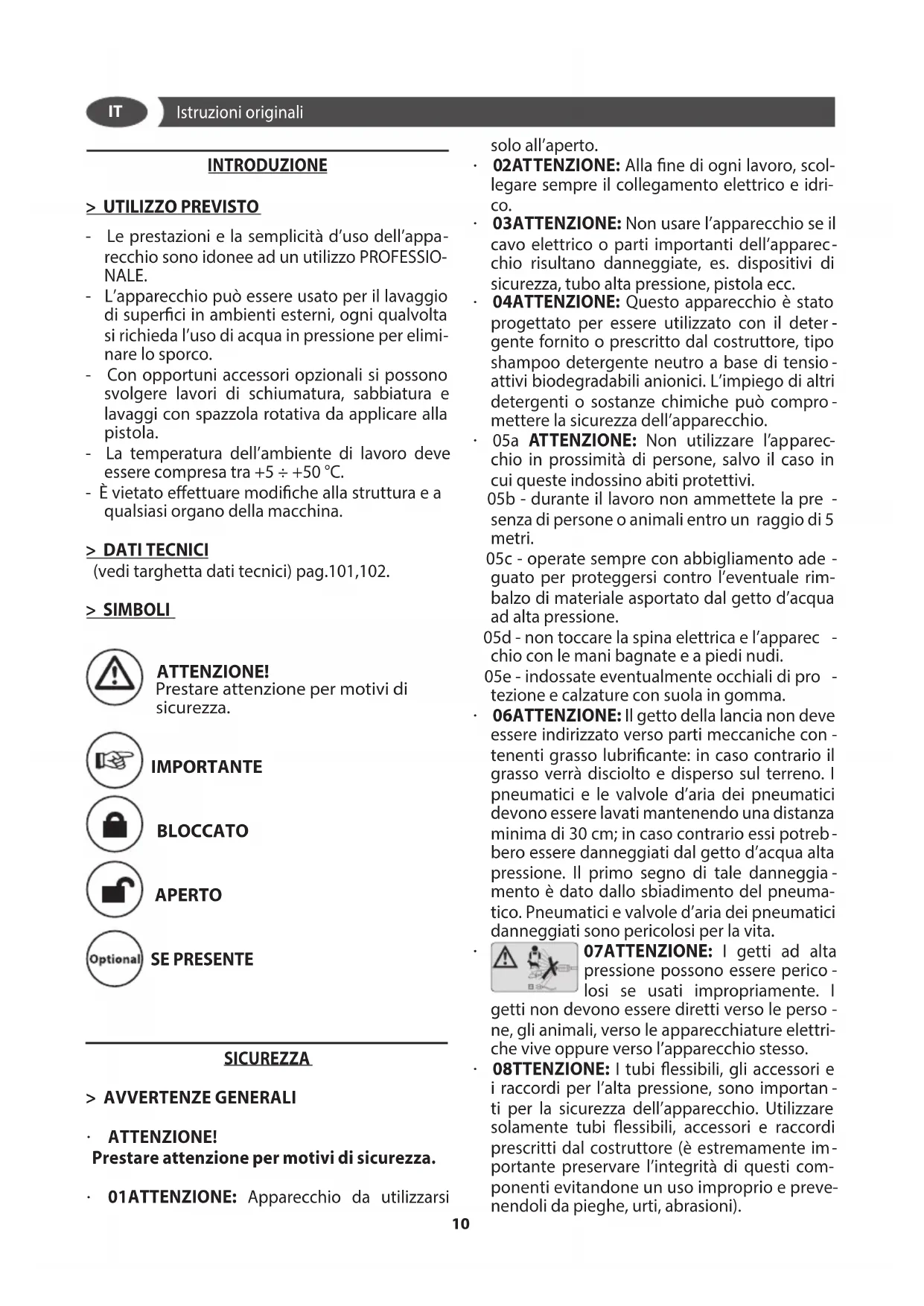 nare lo sporco. - Con opportuni accessori opzionali si possono svolgere lavori di schiumatura, sabbiatura e lavaggi con spazzola rotativa da applicare alla pistola. - La temperatura dell’ambiente di lavoro deve essere compresa tra +5 ÷ +50 °C. - È vietato eettuare modiche alla struttura e a qualsiasi organo della macchina. > DATI TECNICI (vedi targhetta dati tecnici) pag.101,102. > SIMBOLI ATTENZIONE! Prestare attenzione per motivi di sicurezza. IMPORTANTE BLOCCATO APERTO SE PRESENTE SICUREZZA > AVVERTENZE GENERALI