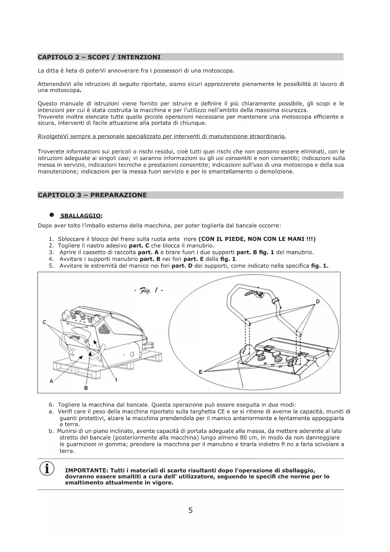 a. Veri care il peso della macchina riportato sulla targhetta CE e se si ritiene di averne la capacità, muniti di guanti protettivi, alzare la macchina prendendola per il manico anteriormente e lentamente appoggiarla a terra. b. Munirsi di un piano inclinato, avente capacità di portata adeguate alla massa, da mettere aderente al lato stretto del bancale (posteriormente alla macchina) lungo almeno 80 cm, in modo da non danneggiare le guarnizioni in gomma; prendere la macchina per il manubrio e tirarla indietro no a farla scivolare a terra. IMPORTANTE: Tutti i materiali di scarto risultanti dopo l’operazione di sballaggio, dovranno essere smaltiti a cura dell’ utilizzatore, seguendo le speci che norme per lo smaltimento attualmente in vigore.6 CONTROLLATE CHE LE PROTEZIONI SIANO PERFETTAMENTE INTEGRE E BEN MONTATE; IN CASO DI DIFETTI O MANCANZE NON PROCEDERE ALLA MESSA IN MOTO E FARNE SUBIRO RICHIESTA AL RIVENDITORE O ALLA CASA MADRE.