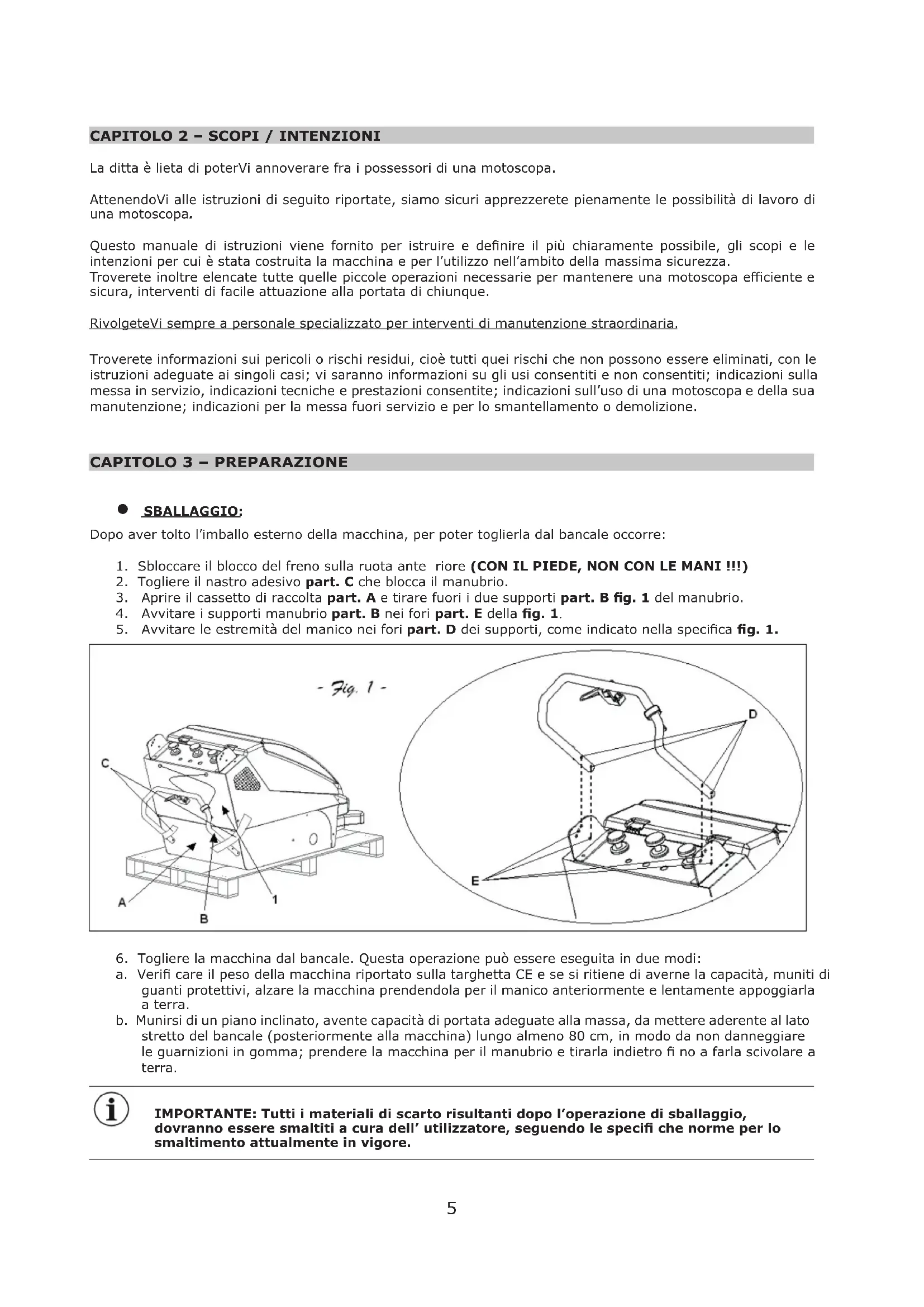 a. Veri care il peso della macchina riportato sulla targhetta CE e se si ritiene di averne la capacità, muniti di guanti protettivi, alzare la macchina prendendola per il manico anteriormente e lentamente appoggiarla a terra. b. Munirsi di un piano inclinato, avente capacità di portata adeguate alla massa, da mettere aderente al lato stretto del bancale (posteriormente alla macchina) lungo almeno 80 cm, in modo da non danneggiare le guarnizioni in gomma; prendere la macchina per il manubrio e tirarla indietro no a farla scivolare a terra. IMPORTANTE: Tutti i materiali di scarto risultanti dopo l’operazione di sballaggio, dovranno essere smaltiti a cura dell’ utilizzatore, seguendo le speci che norme per lo smaltimento attualmente in vigore.6 CONTROLLATE CHE LE PROTEZIONI SIANO PERFETTAMENTE INTEGRE E BEN MONTATE; IN CASO DI DIFETTI O MANCANZE NON PROCEDERE ALLA MESSA IN MOTO E FARNE SUBIRO RICHIESTA AL RIVENDITORE O ALLA CASA MADRE.