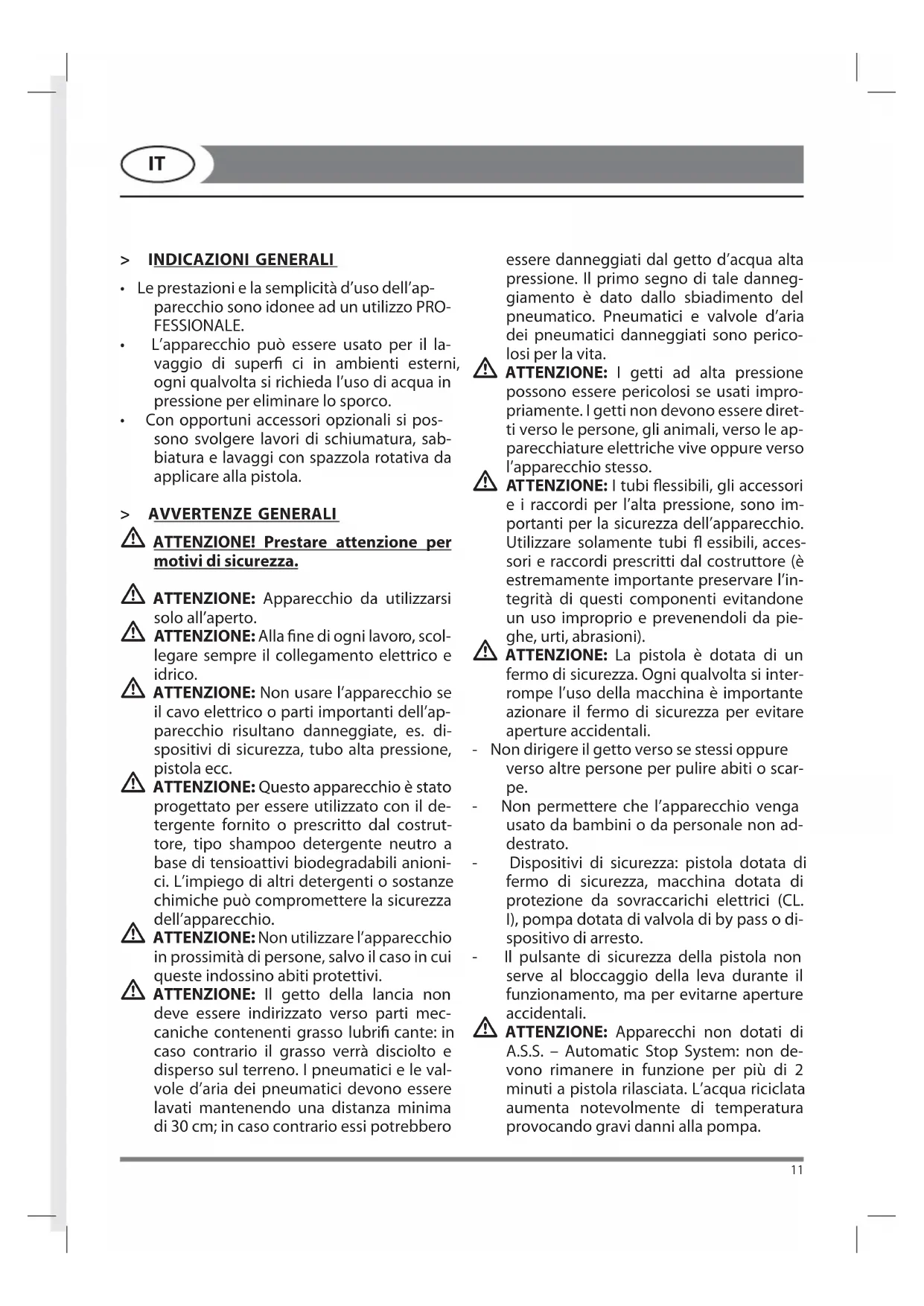 - Con opportuni accessori opzionali si pos- sono svolgere lavori di schiumatura, sab- biatura e lavaggi con spazzola rotativa da applicare alla pistola. > AVVERTENZE GENERALI ATTENZIONE! Prestare attenzione per motivi di sicurezza. ATTENZIONE: Apparecchio da utilizzarsi solo all’aperto. ATTENZIONE: Alla ne di ogni lavoro, scol- legare sempre il collegamento elettrico e idrico. ATTENZIONE: Non usare l’apparecchio se il cavo elettrico o parti importanti dell’ap- parecchio risultano danneggiate, es. di- spositivi di sicurezza, tubo alta pressione, pistola ecc. ATTENZIONE: Questo apparecchio è stato progettato per essere utilizzato con il de- tergente fornito o prescritto dal costrut- tore, tipo shampoo detergente neutro a base di tensioattivi biodegradabili anioni- ci. L’impiego di altri detergenti o sostanze chimiche può compromettere la sicurezza dell’apparecchio. ATTENZIONE: Non utilizzare l’apparecchio in prossimità di persone, salvo il caso in cui queste indossino abiti protettivi. ATTENZIONE: Il getto della lancia non deve essere indirizzato verso parti mec- caniche contenenti grasso lubri cante: in caso contrario il grasso verrà disciolto e disperso sul terreno. I pneumatici e le val- vole d’aria dei pneumatici devono essere lavati mantenendo una distanza minima di 30 cm; in caso contrario essi potrebbero essere danneggiati dal getto d’acqua alta pressione. Il primo segno di tale danneg- giamento è dato dallo sbiadimento del pneumatico. Pneumatici e valvole d’aria dei pneumatici danneggiati sono perico- losi per la vita. ATTENZIONE: I getti ad alta pressione possono essere pericolosi se usati impro- priamente. I getti non devono essere diret- ti verso le persone, gli animali, verso le ap- parecchiature elettriche vive oppure verso l’apparecchio stesso. ATTENZIONE: I tubi essibili, gli accessori e i raccordi per l’alta pressione, sono im- portanti per la sicurezza dell’apparecchio. Utilizzare solamente tubi essibili, acces- sori e raccordi prescritti dal costruttore (è estremamente importante preservare l’in- tegrità di questi componenti evitandone un uso improprio e prevenendoli da pie- ghe, urti, abrasioni). ATTENZIONE: La pistola è dotata di un fermo di sicurezza. Ogni qualvolta si inter- rompe l’uso della macchina è importante azionare il fermo di sicurezza per evitare aperture accidentali. - Non dirigere il getto verso se stessi oppure verso altre persone per pulire abiti o scar- pe. - Non permettere che l’apparecchio venga usato da bambini o da personale non ad- destrato. - Dispositivi di sicurezza: pistola dotata di fermo di sicurezza, macchina dotata di protezione da sovraccarichi elettrici (CL. I), pompa dotata di valvola di by pass o di- spositivo di arresto. - Il pulsante di sicurezza della pistola non serve al bloccaggio della leva durante il funzionamento, ma per evitarne aperture accidentali. ATTENZIONE: Apparecchi non dotati di A.S.S. – Automatic Stop System: non de- vono rimanere in funzione per più di 2 minuti a pistola rilasciata. L’acqua riciclata aumenta notevolmente di temperatura provocando gravi danni alla pompa.12