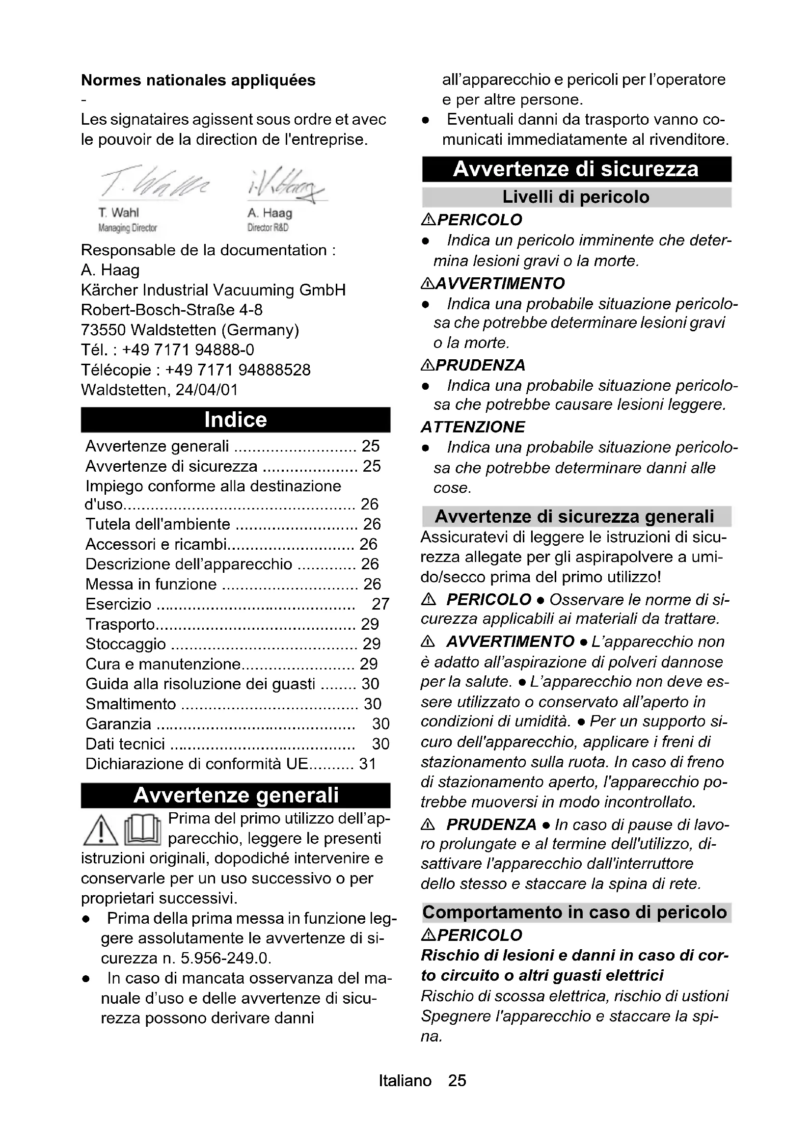 Les signataires agissent sous ordre et avec le pouvoir de la direction de l'entreprise. Responsable de la documentation : A. Haag Kärcher Industrial Vacuuming GmbH Robert-Bosch-Straße 4-8 73550 Waldstetten (Germany) Tél. : +49 7171 94888-0 Télécopie : +49 7171 94888528 Waldstetten, 24/04/01 Indice Avvertenze generali Prima del primo utilizzo dell’ap- parecchio, leggere le presenti istruzioni originali, dopodiché intervenire e conservarle per un uso successivo o per proprietari successivi. ● Prima della prima messa in funzione leg- gere assolutamente le avvertenze di si- curezza n. 5.956-249.0. ● In caso di mancata osservanza del ma- nuale d’uso e delle avvertenze di sicu- rezza possono derivare danni all’apparecchio e pericoli per l’operatore e per altre persone. ● Eventuali danni da trasporto vanno co- municati immediatamente al rivenditore. Avvertenze di sicurezza Livelli di pericolo PERICOLO ● Indica un pericolo imminente che deter- mina lesioni gravi o la morte. 몇 AVVERTIMENTO ● Indica una probabile situazione pericolo- sa che potrebbe determinare lesioni gravi o la morte. 몇 PRUDENZA ● Indica una probabile situazione pericolo- sa che potrebbe causare lesioni leggere. ATTENZIONE ● Indica una probabile situazione pericolo- sa che potrebbe determinare danni alle cose. Avvertenze di sicurezza generali Assicuratevi di leggere le istruzioni di sicu- rezza allegate per gli aspirapolvere a umi- do/secco prima del primo utilizzo! PERICOLO ● Osservare le norme di si- curezza applicabili ai materiali da trattare. 몇 AVVERTIMENTO ● L’apparecchio non è adatto all’aspirazione di polveri dannose per la salute. ● L’apparecchio non deve es