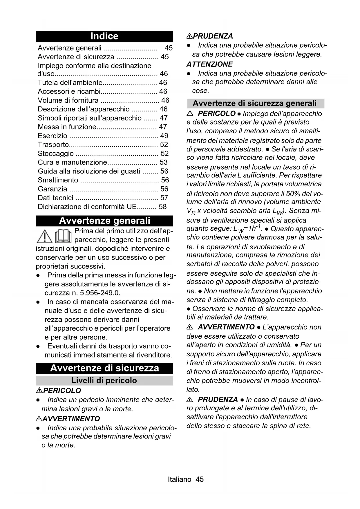 - . ● Questo apparec- chio contiene polvere dannosa per la salu- te. Le operazioni di svuotamento e di manutenzione, compresa la rimozione dei serbatoi di raccolta delle polveri, possono essere eseguite solo da specialisti che in- dossano gli appositi dispositivi di protezio- ne. ● Non mettere in funzione l'apparecchio senza il sistema di filtraggio completo. ● Osservare le norme di sicurezza applica- bili ai materiali da trattare. 몇 AVVERTIMENTO ● L’apparecchio non deve essere utilizzato o conservato all’aperto in condizioni di umidità. ● Per un supporto sicuro dell'apparecchio, applicare i freni di stazionamento sulla ruota. In caso di freno di stazionamento aperto, l'apparec- chio potrebbe muoversi in modo incontrol- lato. 몇 PRUDENZA ● In caso di pause di lavo- ro prolungate e al termine dell'utilizzo, di- sattivare l'apparecchio dall'interruttore dello stesso e staccare la spina di rete. Avvertenze generali p. 45