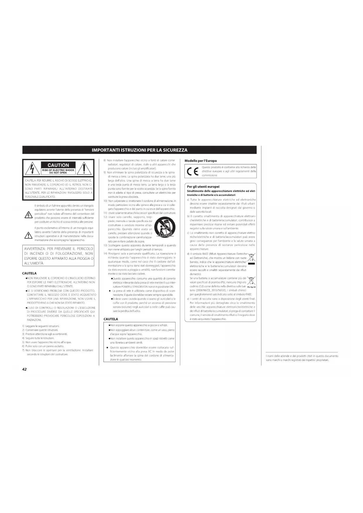 CAUTELA: PER RIDURRE IL RISCHIO DI SCOSSE ELETTRICHE, NON RIMUOVERE IL COPERCHIO (O IL RETRO). NON CI SONO PARTI RIPARABILI ALL’INTERNO DESTINATE ALL’UTENTE. PER LE RIPARAZIONI RIVOLGERSI SOLO A PERSONALE QUALIFICATO. Il simbolo di un fulmine appuntito dentro un triangolo equilatero avverte l’utente della presenza di “tensioni pericolose” non isolate all’interno del contenitore del prodotto che possono essere di intensità sufficiente per costituire un rischio di scossa elettrica alle persone. Il punto esclamativo all’interno di un triangolo equi-latero avverte l’utente della presenza di importanti istruzioni operative e di manutenzione nella docu-mentazione che accompagna l’apparecchio.