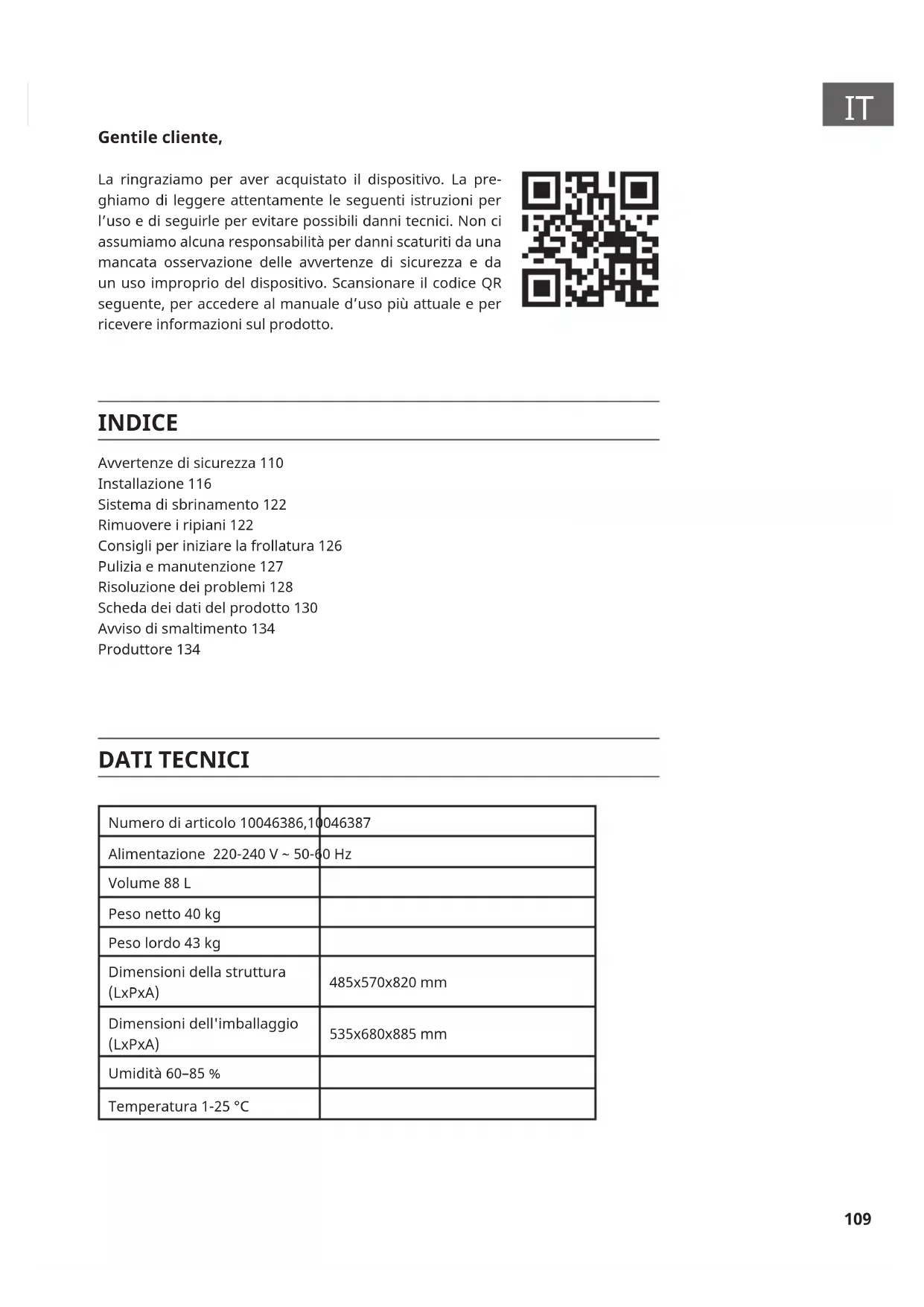 Gentile cliente, La ringraziamo per aver acquistato il dispositivo. La pre- ghiamo di leggere attentamente le seguenti istruzioni per l’uso e di seguirle per evitare possibili danni tecnici. Non ci assumiamo alcuna responsabilità per danni scaturiti da una mancata osservazione delle avvertenze di sicurezza e da un uso improprio del dispositivo. Scansionare il codice QR seguente, per accedere al manuale d’uso più attuale e per ricevere informazioni sul prodotto. INDICE DATI TECNICI Numero di articolo 10046386,10046387 Alimentazione 220-240 V ~ 50-60 Hz Volume 88 L Peso netto 40 kg Peso lordo 43 kg Dimensioni della struttura (LxPxA) 485x570x820 mm Dimensioni dell'imballaggio (LxPxA) 535x680x885 mm Umidità 60–85 % Temperatura 1-25 °C Avvertenze di sicurezza 110 Installazione 116 Sistema di sbrinamento 122 Rimuovere i ripiani 122 Consigli per iniziare la frollatura 126 Pulizia e manutenzione 127 Risoluzione dei problemi 128 Scheda dei dati del prodotto 130 Avviso di smaltimento 134 Produttore 134110