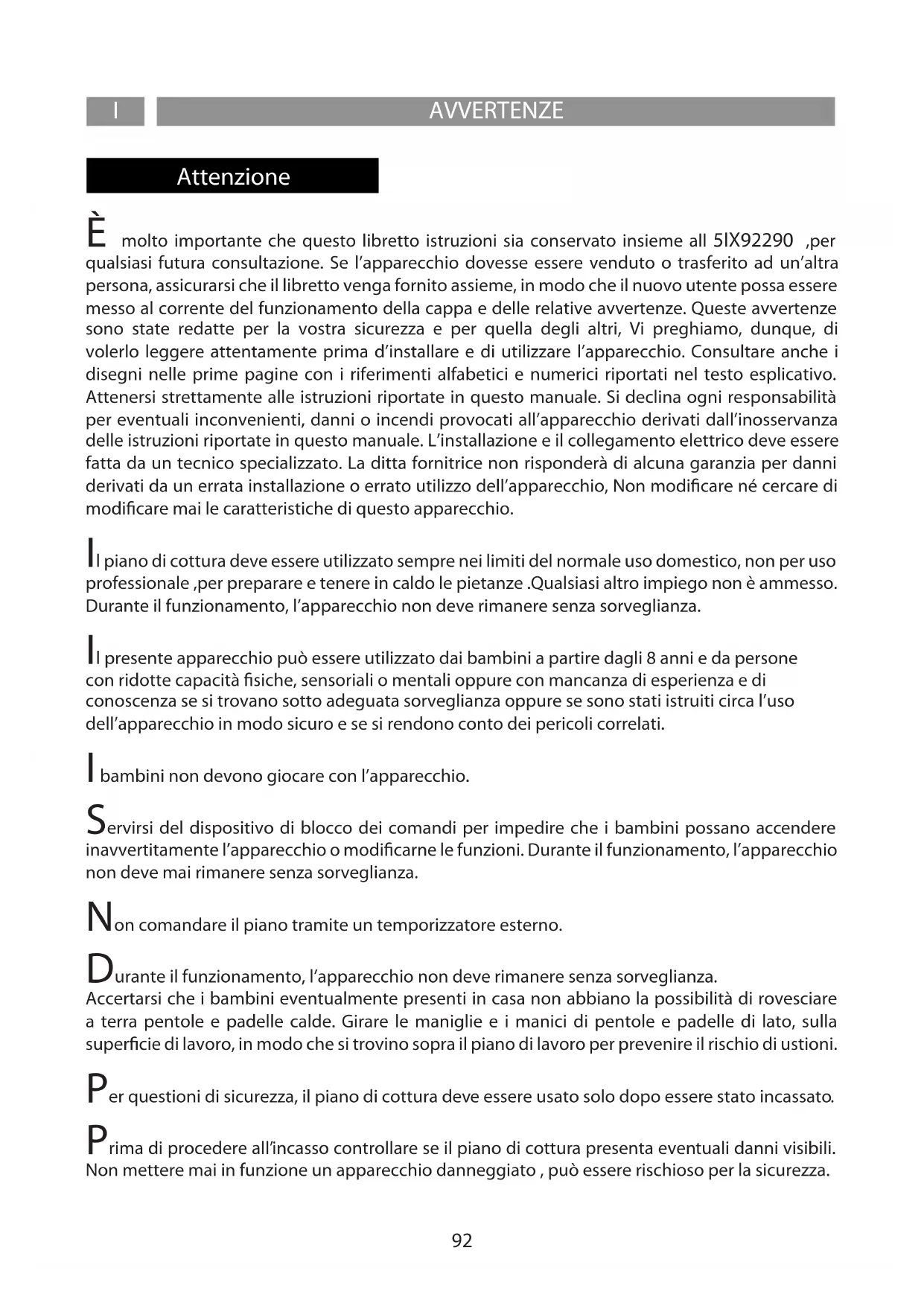 Attenzione È molto importante che questo libretto istruzioni sia conservato insieme all 5IX92290 ,per qualsiasi futura consultazione. Se l’apparecchio dovesse essere venduto o trasferito ad un’altra persona, assicurarsi che il libretto venga fornito assieme, in modo che il nuovo utente possa essere messo al corrente del funzionamento della cappa e delle relative avvertenze. Queste avvertenze sono state redatte per la vostra sicurezza e per quella degli altri, Vi preghiamo, dunque, di volerlo leggere attentamente prima d’installare e di utilizzare l’apparecchio. Consultare anche i disegni nelle prime pagine con i riferimenti alfabetici e numerici riportati nel testo esplicativo. Attenersi strettamente alle istruzioni riportate in questo manuale. Si declina ogni responsabilità per eventuali inconvenienti, danni o incendi provocati all’apparecchio derivati dall’inosservanza delle istruzioni riportate in questo manuale. L’installazione e il collegamento elettrico deve essere fatta da un tecnico specializzato. La ditta fornitrice non risponderà di alcuna garanzia per danni derivati da un errata installazione o errato utilizzo dell’apparecchio, Non modicare né cercare di modicare mai le caratteristiche di questo apparecchio. Il piano di cottura deve essere utilizzato sempre nei limiti del normale uso domestico, non per uso professionale ,per preparare e tenere in caldo le pietanze .Qualsiasi altro impiego non è ammesso. Durante il funzionamento, l’apparecchio non deve rimanere senza sorveglianza. Il presente apparecchio può essere utilizzato dai bambini a partire dagli 8 anni e da persone con ridotte capacità siche, sensoriali o mentali oppure con mancanza di esperienza e di conoscenza se si trovano sotto adeguata sorveglianza oppure se sono stati istruiti circa l’uso dell’apparecchio in modo sicuro e se si rendono conto dei pericoli correlati. I bambini non devono giocare con l’apparecchio. Servirsi del dispositivo di blocco dei comandi per impedire che i bambini possano accendere inavvertitamente l’apparecchio o modicarne le funzioni. Durante il funzionamento, l’apparecchio non deve mai rimanere senza sorveglianza. Non comandare il piano tramite un temporizzatore esterno. Durante il funzionamento, l’apparecchio non deve rimanere senza sorveglianza. Accertarsi che i bambini eventualmente presenti in casa non abbiano la possibilità di rovesciare a terra pentole e padelle calde. Girare le maniglie e i manici di pentole e padelle di lato, sulla supercie di lavoro, in modo che si trovino sopra il piano di lavoro per prevenire il rischio di ustioni. Per questioni di sicurezza, il piano di cottura deve essere usato solo dopo essere stato incassato. Prima di procedere all’incasso controllare se il piano di cottura presenta eventuali danni visibili. Non mettere mai in funzione un apparecchio danneggiato , può essere rischioso per la sicurezza.AVVERTENZE