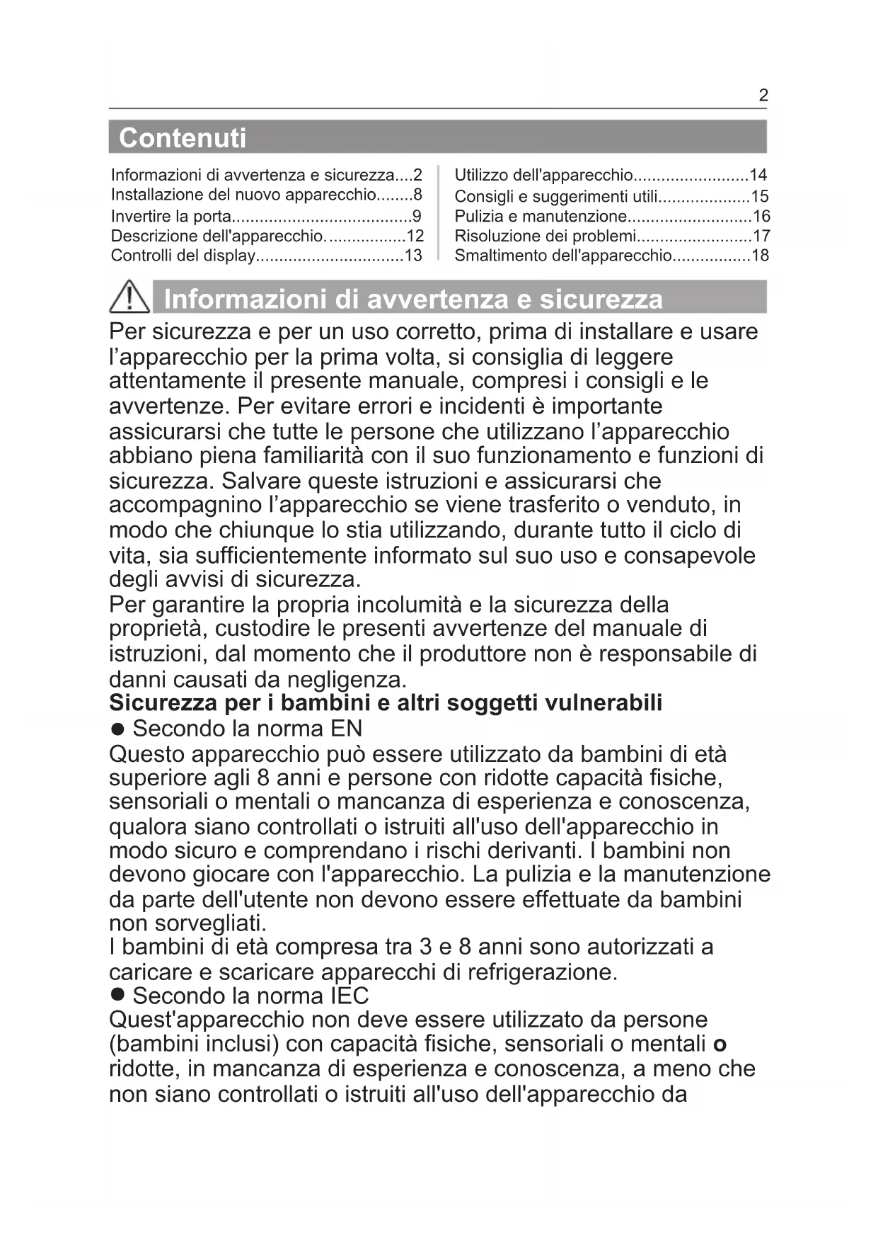 - L'apparecchio è destinato solo alla conservazione di alimenti e/o bevande in ambito domestico, come illustrato in quello libretto di istruzioni. Fare attentionione quando si sposta l'apparecchio in quanto è pesante.