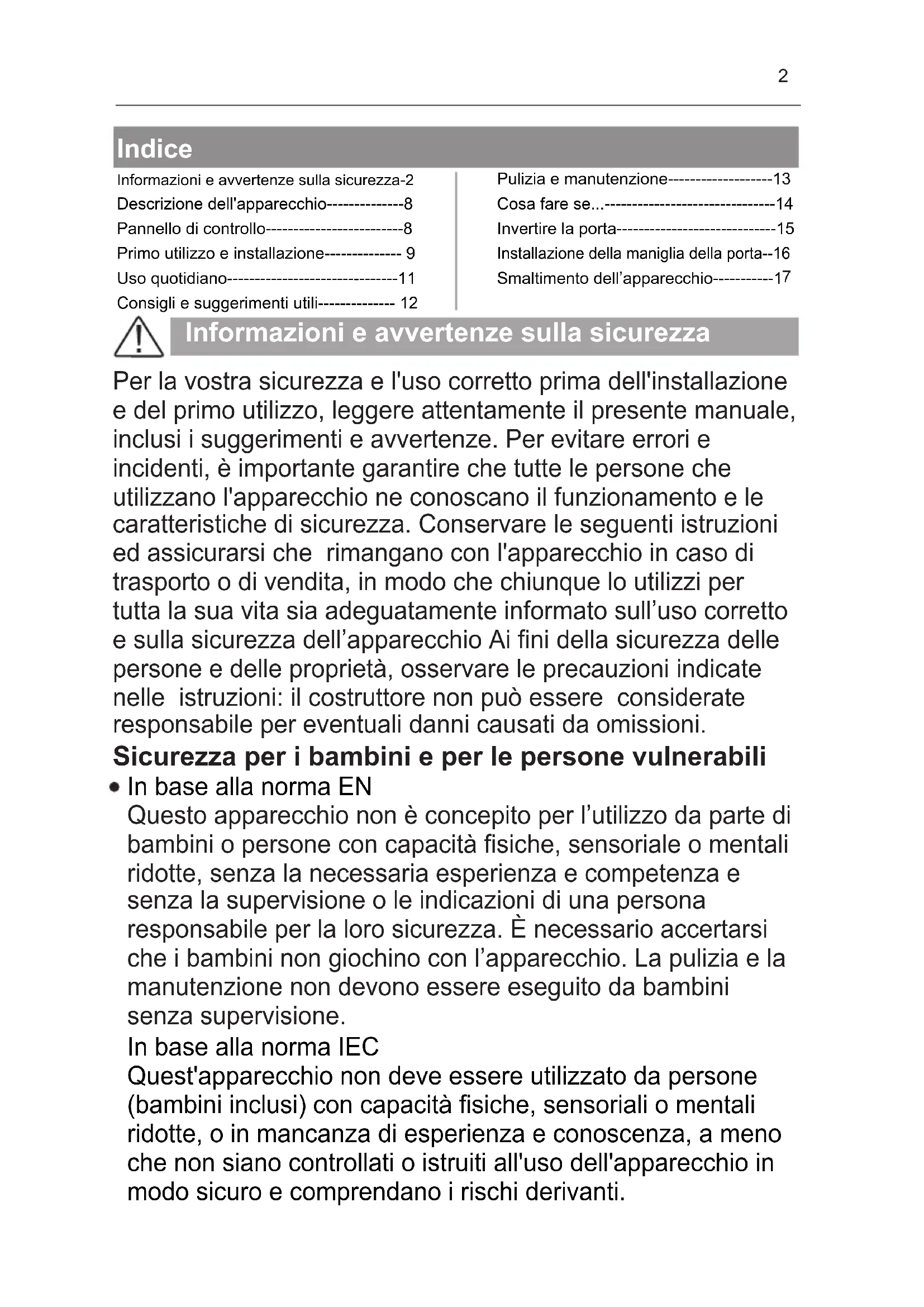 ~Indice Per la vostra sicurezza e l'uso corretto prima dell'installazione e del primo utilizzo, leggere attentamente il presente manuale, inclusi i suggerimenti e avvertenze. Per evitare errori e incidenti, è importante garantire che tutte le persone che utilizzano l'apparecchio ne conoscano il funzionamento e le caratteristiche di sicurezza. Conservare le seguenti istruzioni ed assicurarsi che rimangano con l'apparecchio in caso di trasporto o di vendita, in modo che chiunque lo utilizzi per tutta la sua vita sia adeguatamente informato sull’uso corretto e sulla sicurezza dell’apparecchio Ai fini della sicurezza delle persone e delle proprietà, osservare le precauzioni indicate nelle istruzioni: il costruttore non può essere considerate responsabile per eventuali danni causati da omissioni. Sicurezza per i bambini e per le persone vulnerabili In base alla norma EN Questo apparecchio non è concepito per l’utilizzo da parte di bambini o persone con capacità fisiche, sensoriale o mentali ridotte, senza la necessaria esperienza e competenza e senza la supervisione o le indicazioni di una persona responsabile per la loro sicurezza. È necessario accertarsi che i bambini non giochino con l’apparecchio. La pulizia e la manutenzione non devono essere eseguito da bambini senza supervisione. In base alla norma IEC Quest'apparecchio non deve essere utilizzato da persone (bambini inclusi) con capacità fisiche, sensoriali o mentali ridotte, o in mancanza di esperienza e conoscenza, a meno che non siano controllati o istruiti all'uso dell'apparecchio in modo sicuro e comprendano i rischi derivanti. Informazioni e avvertenze sulla sicurezza Informazioni e avvertenze sulla sicurezza-2 Descrizione dell'apparecchio--------------8 Pannello di controllo-------------------------8 Primo utilizzo e installazione-------------- 9 Uso quotidiano-------------------------------11 Pulizia e manutenzione-------------------13 Consigli e suggerimenti utili-------------- 12 Cosa fare se...-------------------------------14 Invertire la porta-----------------------------15 Installazione della maniglia della porta--16 Smaltimento dell’apparecchio-----------1