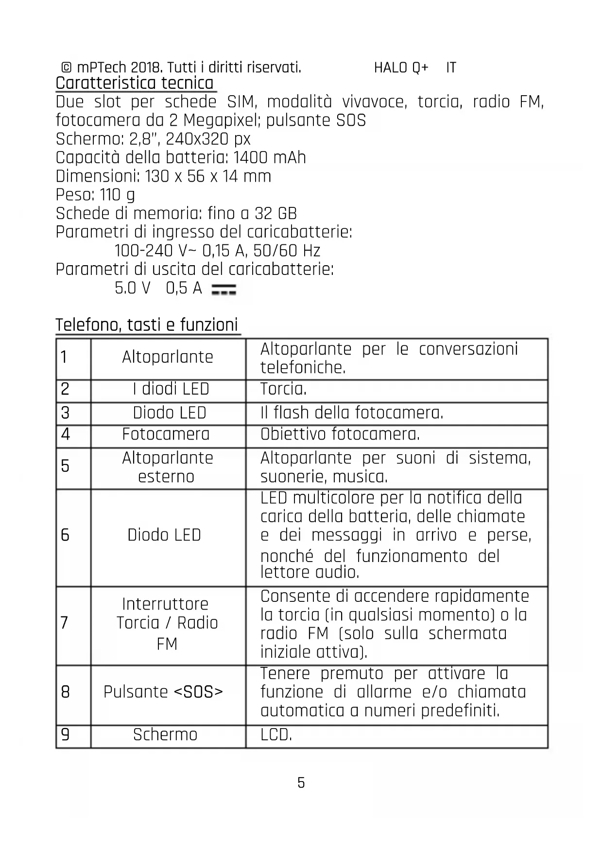 Sbloccare il telefono e selezionare un contatto dalla rubrica telefonica – [Contatti]. Premere il tasto <Cornetta verde>, per effettuare la chiamata. Premere il tasto <Cornetta rossa>, per terminare la chiamata. Rispondere a una telefonata Quando il telefono squilla, premere il tasto <Cornetta verde> per rispondere a una chiamata in arrivo. Premere il tasto <Cornetta rossa>, per rifiutare/terminare la chiamata. Messaggi di testo Creazione e invio di messaggi Scegliere [Menù] > [Messaggi] > [Scrivi un messaggio]. Inserire il contenuto del messaggio utilizzando il tastierino numerico. I caratteri vengono inseriti lettera per lettera. Il telefono non dispone di un dizionario. Il tasto <#> cambia la modalità di scrittura. Sono disponibili le seguenti modalità: Abc - la prima lettera maiuscola, il resto minuscolo con con caratteri speciali, abc - solo lettere minuscole con caratteri speciali, ABC - solo lettere maiuscole con caratteri speciali, 123 – solo cifre. Per inserire un carattere speciale, ad esempio: un punto, una virgola, un trattino, ecc., premere il tasto <*> e selezionare il simbolo desiderato dall’elenco, oppure premere il tasto 1 per il numero di volte appropriato. Per inserire la spaziatura tra le parole (spazi), premere il tasto 0. Dopo aver inserito il messaggio, premere [Impostazioni] > [Invia a], e quindi inserire il numero utilizzando il tastierino numerico o aggiungerlo dall’elenco telefonico. Dopo aver inserito il numero/selezionato un contatto, selezionare [Impostazioni] > [Invia], per inviare il messaggio.© mPTech 2018. Tutti i diritti riservati. HALO Q+ IT