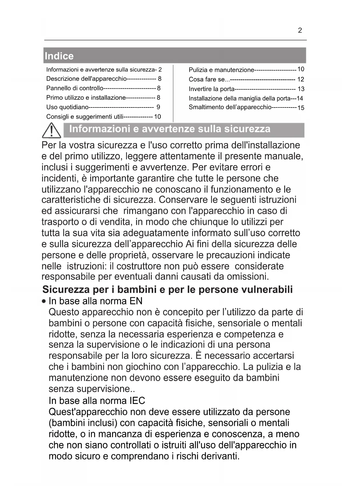 ~Indice Per la vostra sicurezza e l'uso corretto prima dell'installazione e del primo utilizzo, leggere attentamente il presente manuale, inclusi i suggerimenti e avvertenze. Per evitare errori e incidenti, è importante garantire che tutte le persone che utilizzano l'apparecchio ne conoscano il funzionamento e le caratteristiche di sicurezza. Conservare le seguenti istruzioni ed assicurarsi che rimangano con l'apparecchio in caso di trasporto o di vendita, in modo che chiunque lo utilizzi per tutta la sua vita sia adeguatamente informato sull’uso corretto e sulla sicurezza dell’apparecchio Ai fini della sicurezza delle persone e delle proprietà, osservare le precauzioni indicate nelle istruzioni: il costruttore non può essere considerate responsabile per eventuali danni causati da omissioni. Sicurezza per i bambini e per le persone vulnerabili In base alla norma EN Questo apparecchio non è concepito per l’utilizzo da parte di bambini o persone con capacità fisiche, sensoriale o mentali ridotte, senza la necessaria esperienza e competenza e senza la supervisione o le indicazioni di una persona responsabile per la loro sicurezza. È necessario accertarsi che i bambini non giochino con l’apparecchio. La pulizia e la manutenzione non devono essere eseguito da bambini senza supervisione.. In base alla norma IEC Quest'apparecchio non deve essere utilizzato da persone (bambini inclusi) con capacità fisiche, sensoriali o mentali ridotte, o in mancanza di esperienza e conoscenza, a meno che non siano controllati o istruiti all'uso dell'apparecchio in modo sicuro e comprendano i rischi derivanti. Informazioni e avvertenze sulla sicurezza Informazioni e avvertenze sulla sicurezza- 2 Descrizione dell'apparecchio-------------- 8 Pannello di controllo------------------------- 8 Primo utilizzo e installazione-------------- 8 Uso quotidiano------------------------------- 9 Pulizia e manutenzione-------------------- Consigli e suggerimenti utili-------------- Cosa fare se...------------------------------- 12 Invertire la porta----------------------------- 13 Installazione della maniglia della porta---14 Smaltimento dell’apparecchio------------