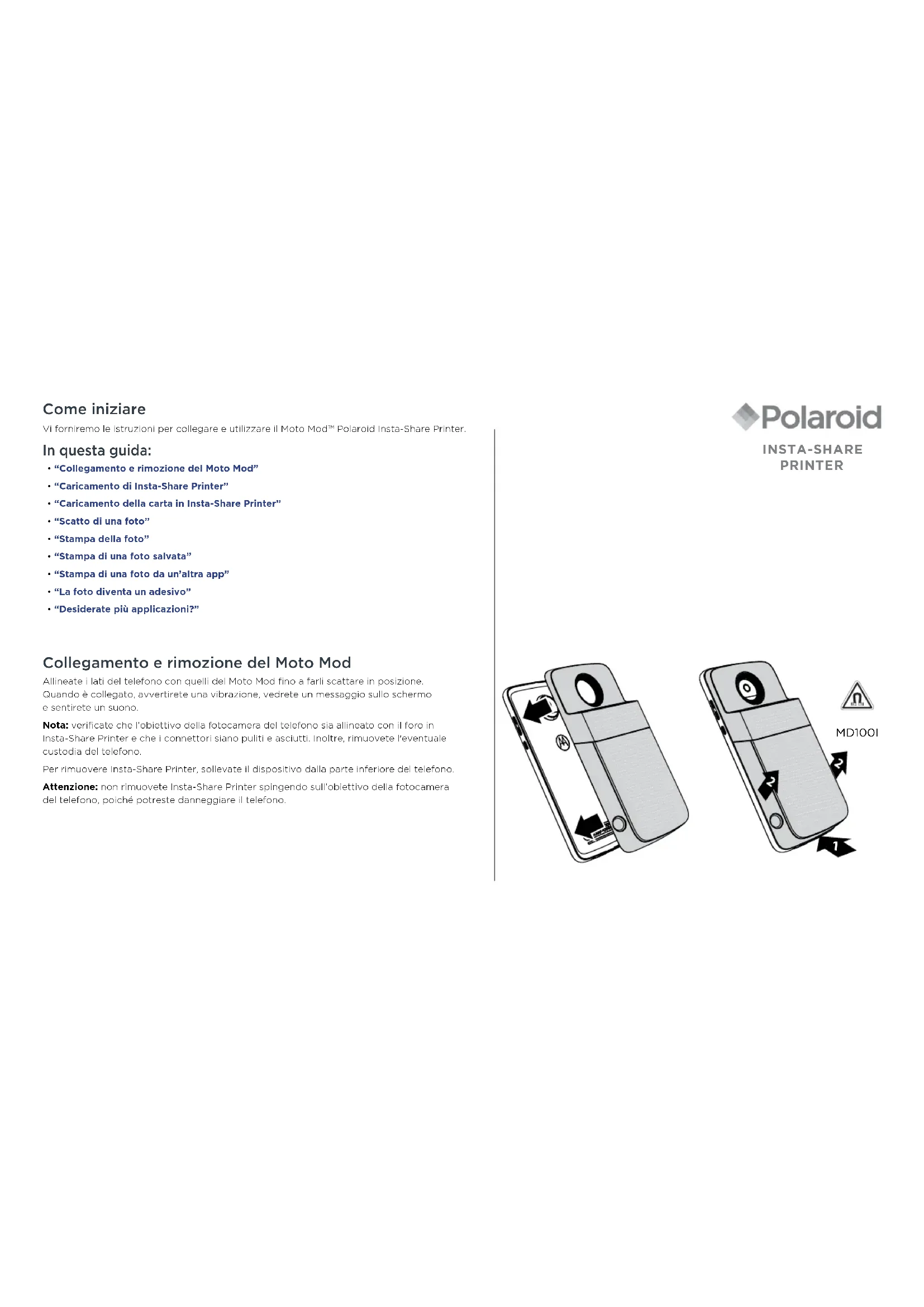 - “Collegamento e rimozione del Moto Mod”• “Caricamento di Insta-Share Printer”• “Caricamento della carta in Insta-Share Printer”• “Scatto di una foto”• “Stampa della foto”• “Stampa di una foto salvata”• “Stampa di una foto da un’altra app”• “La foto diventa un adesivo”• “Desiderate più applicazioni?” Collegamento e rimozione del Moto Mod Allineate i lati del telefono con quelli del Moto Mod fino a farli scattare in posizione. Quando è collegato, avvertirete una vibrazione, vedrete un messaggio sullo schermo esentirete un suono. Nota: verificate che l'obiettivo della fotocamera del telefono sia allineato con il foro in Insta-Share Printer e che i connettori siano puliti e asciutti. Inoltre, rimuovete l'eventuale custodia del telefono.Per rimuovere Insta-Share Printer, sollevate il dispositivo dalla parte inferiore del telefono. Attenzione: non rimuovete Insta-Share Printer spingendo sull'obiettivo della fotocamera del telefono, poiché potreste danneggiare il telefono. INSTA-SHARE PRINTER