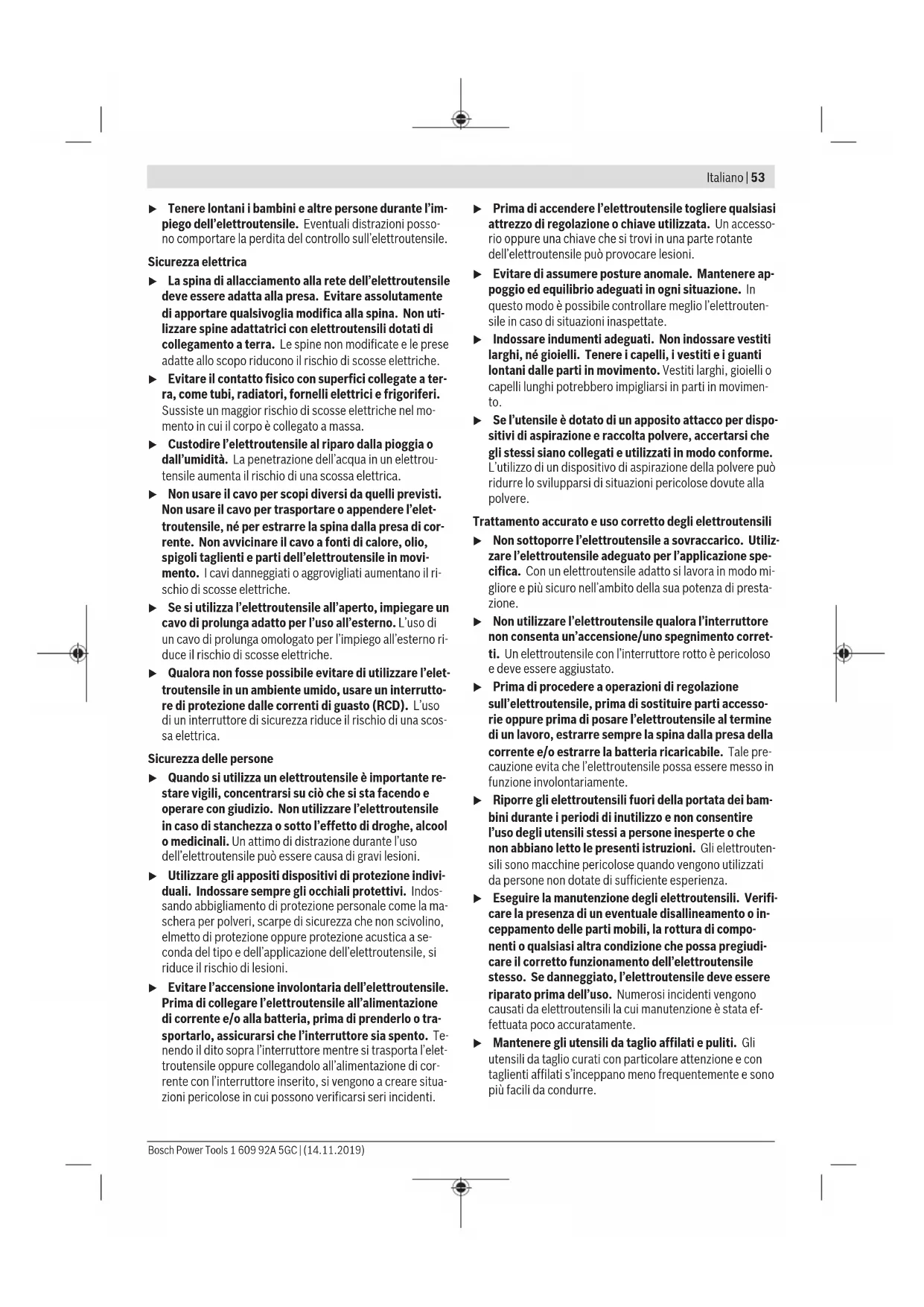 u Utilizzare esclusivamente dotazione originale specifi- ca del modello, prestando attenzione al numero di sca- nalature di identificazione (25). Andranno utilizzati esclusivamente mandrini intercambiabili con due o tre scanalature di identificazione. Qualora venga utilizzato un mandrino intercambiabile non idoneo all’elettroutensi- le, l’utensile accessorio potrebbe cadere durante il funzio- namento. – Prima dell’introduzione, pulire il mandrino intercambiabi- le ed applicare un leggero strato di grasso sul codolo. – Afferrare con l’intera mano il mandrino intercambiabile SDS plus (2), oppure il mandrino autoserrante intercam- biabile (1). Ruotandolo, spingere il mandrino intercam- biabile sul relativo attacco (24), fino ad avvertire chiara- mente un rumore d’innesto. – Il mandrino intercambiabile si bloccherà automaticamen- te. Verificare il bloccaggio, esercitando trazione sul man- drino intercambiabile. Cambio degli utensili La protezione antipolvere (4) impedisce in ampia parte che la polvere di foratura penetri nel portautensile durante l’ese- cuzione del foro. Assicurarsi che, durante l’inserimento dell’utensile, la protezione antipolvere (4) non venga dan- neggiata. u Una protezione antipolvere danneggiata dev’essere sostituita immediatamente. Si consiglia di affidare l’operazione ad un Centro di Assistenza Clienti. Cambio utensile (SDS-plus) Introduzione dell’utensile accessorio SDS plus (vedere Fig. E) Con il mandrino portapunta SDS-plus è possibile sostituire l’utensile accessorio in modo facile e comodo senza l’impie- go di ulteriori attrezzi. – GBH18V-26F: introdurre il mandrino intercambiabile SDS plus (2). – Pulire il codolo dell’utensile accessorio ed applicarvi un leggero strato di grasso. – Introdurre l’utensile accessorio nell’attacco utensile, ruo- tandolo sino a farlo bloccare automaticamente. – Verificare il bloccaggio, esercitando trazione sull’accesso- rio. Il sistema dell’accessorio SDS-plus è un sistema mobile. In questo modo, in caso di funzionamento a vuoto, si verifica un’oscillazione radiale. Ciò non influisce sulla precisione del foro in quanto la centratura della punta avviene automatica- mente durante la foratura. Rimozione dell’utensile accessorio SDS-plus (vedere figura F) – Spingere indietro la bussola di serraggio (5) e rimuovere l’utensile accessorio. Cambio utensile (senza SDS-plus) (GBH18V-26) Introduzione dell’utensile accessorio (vedere Fig. G) Avvertenza: Non impiegare utensili senza sistema SDS plus per eseguire forature a percussione o scalpellature. Durante tali operazioni, utensili senza sistema SDS plus e i relativi mandrini verrebbero danneggiati. – Introdurre un mandrino a cremagliera (22). – Aprire il mandrino a cremagliera (22) ruotando, fino a quando sia possibile introdurre l’accessorio. Introdurre l’accessorio. – Innestare la chiave di serraggio per mandrini (26) negli appositi fori del mandrino a cremagliera (22) e serrare uniformemente l’accessorio. – Ruotare l’interruttore di arresto percussione/rotazione (16) in posizione «Foratura». Rimozione dell’utensile accessorio (vedere figura H) – Ruotare in senso antiorario la bussola del mandrino a cre- magliera (22), mediante la chiave di serraggio per man- drini (26), fino a quando sia possibile rimuovere l’utensile accessorio. Cambio utensile (senza SDS-plus) (GBH18V-26F) Introduzione dell’utensile accessorio (vedere Fig. I) Avvertenza: Non impiegare utensili senza sistema SDS plus per eseguire forature a percussione o scalpellature. Durante tali operazioni, utensili senza sistema SDS plus e i relativi mandrini verrebbero danneggiati. – Introdurre il mandrino autoserrante intercambiabile (1). – Trattenere saldamente l’anello di tenuta (28) del mandri- no autoserrante intercambiabile. Aprire l’attacco utensile ruotando la bussola anteriore (27), fino a quando sia pos- sibile inserire l’utensile. Trattenere saldamente l’anello di tenuta (28) e ruotare con forza la bussola anteriore (27) in direzione della freccia, fino ad avvertire chiaramente un rumore d’innesto. 1 609 92A 5GC | (14.11.2019) Bosch Power ToolsItaliano | 59 – Verificare il corretto inserimento in sede, esercitando tra- zione sull’accessorio. Avvertenza: Se l’attacco utensile è stato aperto fino a battu- ta, è possibile che, chiudendo l’attacco stesso, si avverta un rumore d’innesto e che l’attacco non si chiuda. In tale caso, ruotare una singola volta la bussola anteriore (27) in direzione opposta a quella della freccia. Successiva- mente, sarà possibile chiudere l’attacco utensile. – Ruotare l’interruttore di arresto percussione/rotazione (16) in posizione «Foratura». Rimozione dell’utensile accessorio (vedere Fig. J) – Trattenere saldamente l’anello di tenuta (28) del mandri- no autoserrante intercambiabile. Aprire l’attacco utensile ruotando la bussola anteriore (27) in direzione della frec- cia, fino a quando sia possibile rimuovere l’utensile. Aspirazione polvere/aspirazione trucioli Polveri e materiali come vernici contenenti piombo, alcuni ti- pi di legname, minerali e metalli possono essere dannosi per la salute. Il contatto oppure l’inalazione delle polveri possono causare reazioni allergiche e/o malattie delle vie respiratorie dell’operatore oppure delle persone che si trovano nelle vici- nanze. Determinate polveri come polvere da legname di faggio o di quercia sono considerate cancerogene, in modo particolare insieme ad additivi per il trattamento del legname (cromato, protezione per legno). Materiale contenente amianto deve essere lavorato esclusivamente da personale specializzato. – Utilizzare possibilmente un’aspirazione polvere adatta per il materiale. – Provvedere ad una buona aerazione del posto di lavoro. – Si consiglia di portare una mascherina protettiva con clas- se di filtraggio P2. Osservare le norme in vigore nel vostro Paese per i materiali da lavora