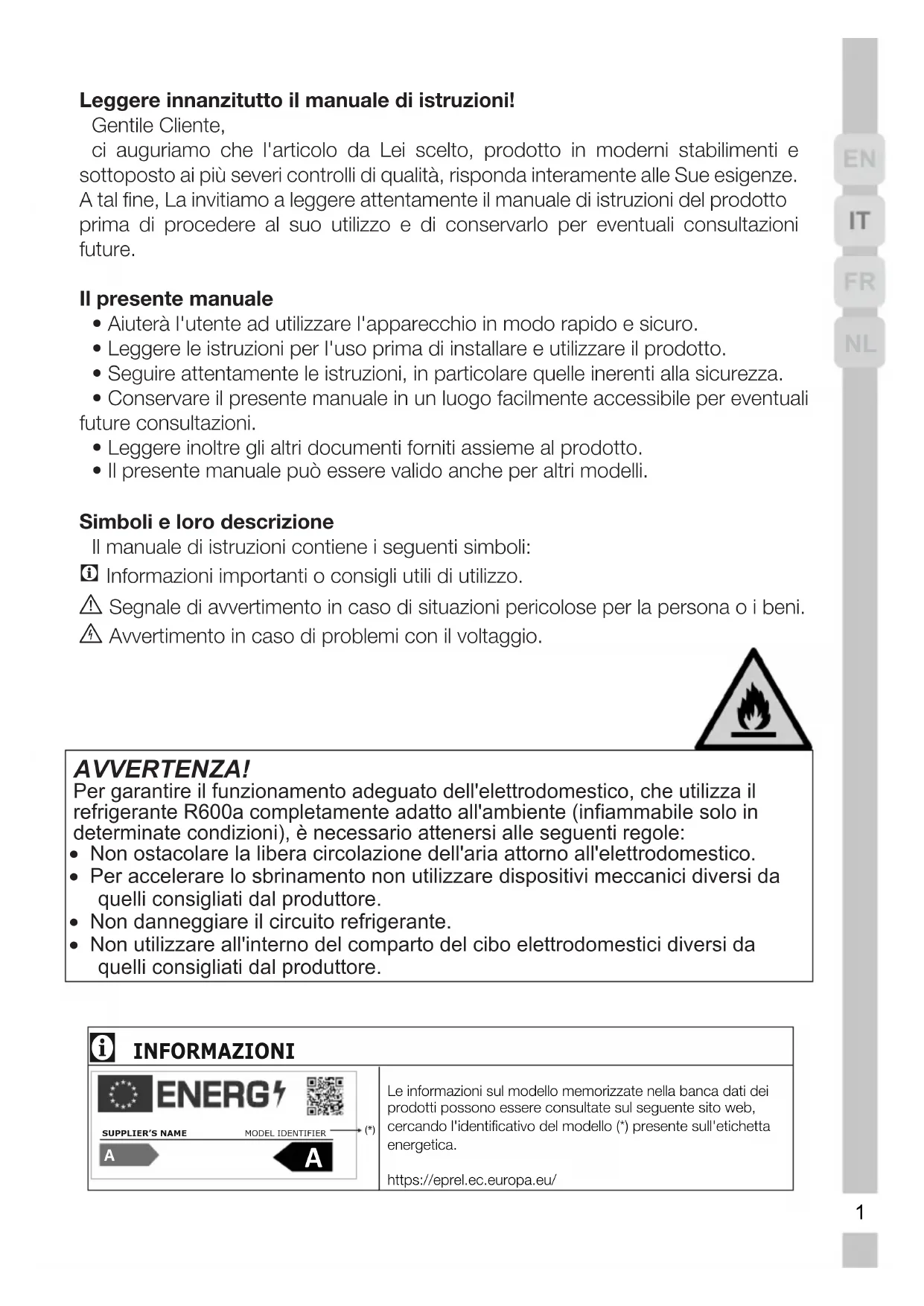 - Il presente manuale può essere valido anche per altri modelli. Simboli e loro descrizione Il manuale di istruzioni contiene i seguenti simboli: C Informazioni importanti o consigli utili di utilizzo. A Segnale di avvertimento in caso di situazioni pericolose per la persona o i beni. B Avvertimento in caso di problemi con il voltaggio. AVVERTENZA! Per garantire il funzionamento adeguato dell'elettrodomestico, che utilizza il refrigerante R600a completamente adatto all'ambiente (infiammabile solo in determinate condizioni), è necessario attenersi alle seguenti regole: