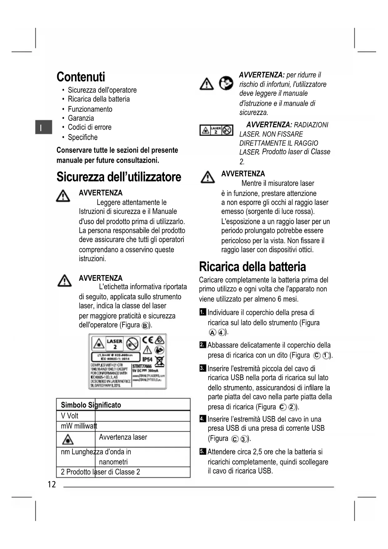 Simbolo Signicato V Volt mW milliwatt Avvertenza laser nm Lunghezza d’onda in nanometri 2 Prodotto laser di Classe 2 AVVERTENZA: per ridurre il rischio di infortuni, l'utilizzatore deve leggere il manuale d'istruzione e il manuale di sicurezza. AVVERTENZA: RADIAZIONI